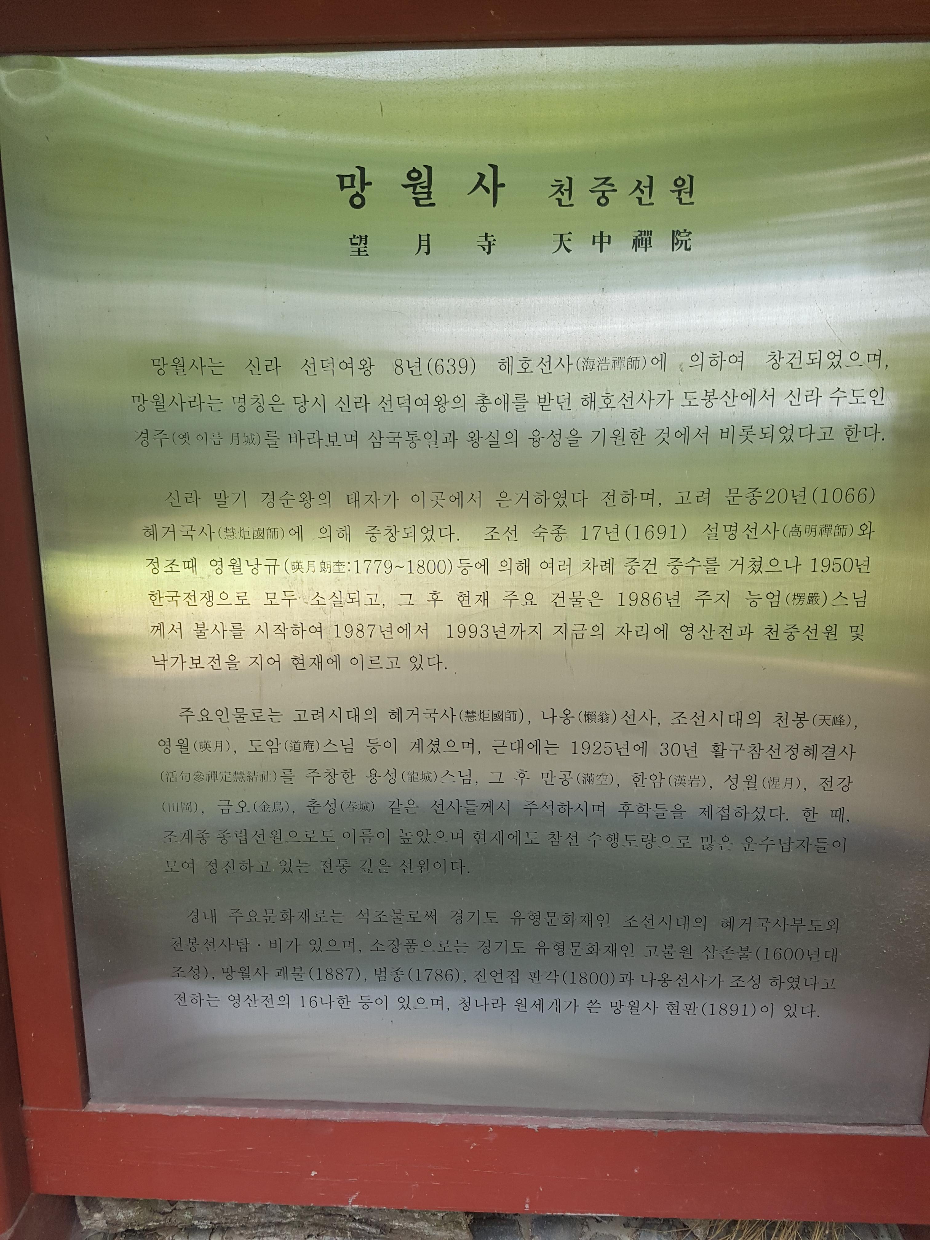 의정부시 호원동에 있는 망월사는 지하철 망월사역에서 원도봉계곡으로 3km정도 도봉산 중턱에 있는 천년고찰로서 대한불교 조계종에 속한 사찰이다. 639년(선덕여왕 8) 해호(海浩)가 창건하였으며, 망월사라고 부르게 되었다. 신라 말기 경순왕의 태자가 이곳에 은거했다고 하며, 1066년(문종 20) 혜거국사(慧炬國師)가 절을 중창하였다. 그 뒤의 자세한 역사는 전하지 않으나 14차례의 병화와 전란으로 절이 황폐해졌다가 1691년(숙종 17) 동계(東溪)가 중건하였다. 그 뒤 영월(暎月)이 수십 년 동안을 이 절에 머물면서 1779년(정조 3) 선월당(先月堂)을 세웠고, 1800년 선월당을 옛 영산전(靈山殿) 터로 이전하였으며, 1818년(순조 18) 칠성각을 신축하고 1827년 절 전체를 중수하였다. 1880년(고종 17) 완송(玩松)이 중건하였고, 1882년 완송이 영산전을 다시 세웠으며, 1884년 인파(仁坡)가 독성각(獨聖閣)을 건립하였다. 1885년 완송이 약사전(藥師殿)을 건립하였고, 1901년(광무 5) 인파가 큰방을 보수하였다. 1906년 회광(晦光)이 선실(禪室)과 설법루(說法樓)를 중수하였고, 1941년 김응운(金應運)이 약사전을 중건하였다.