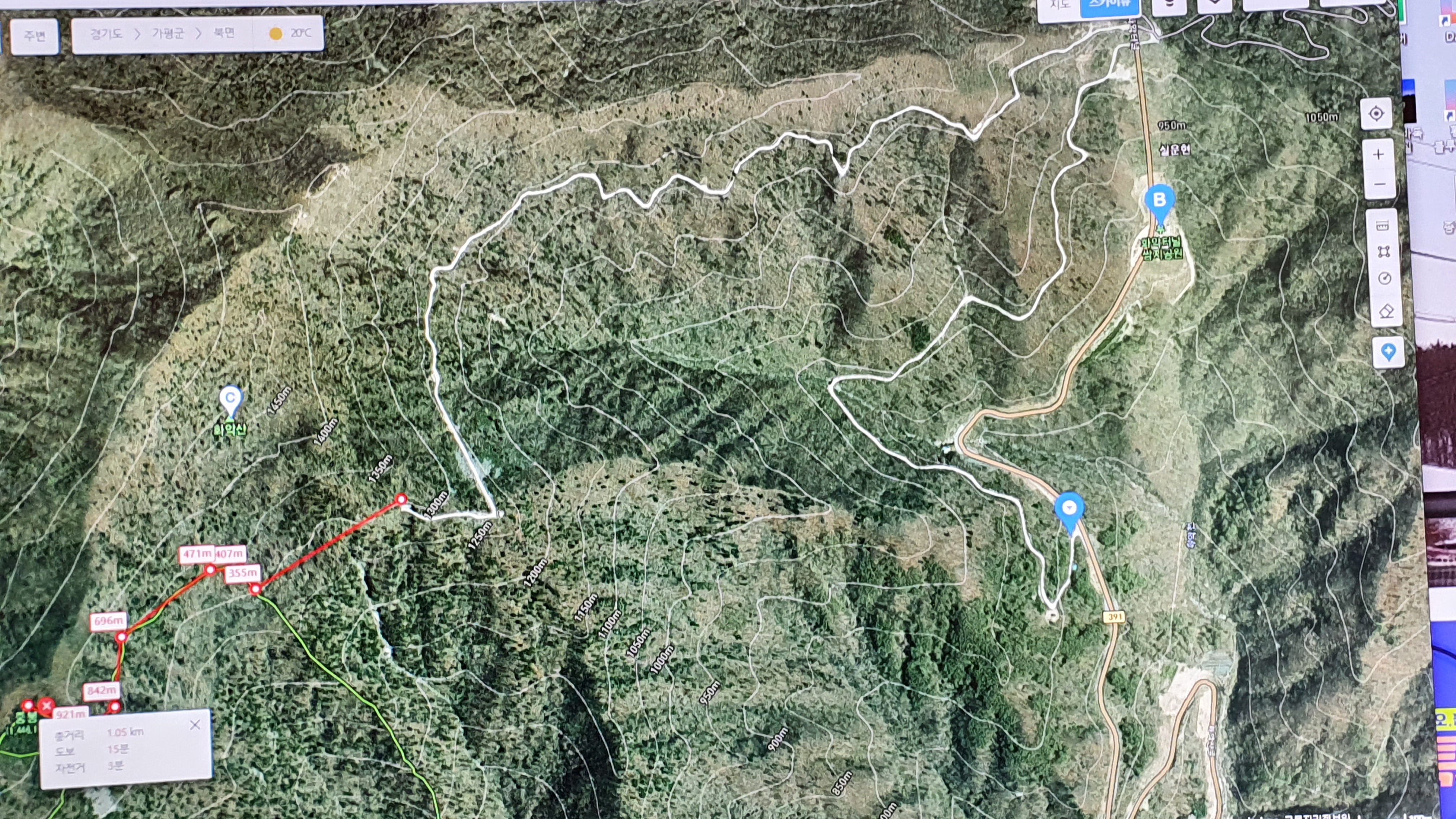 가평 북면 소재지에서 391번 지방도로 - 화악터널 쌈지공원 도착 전 공군부대 삼거리 좌회전 한참 올라오면 -