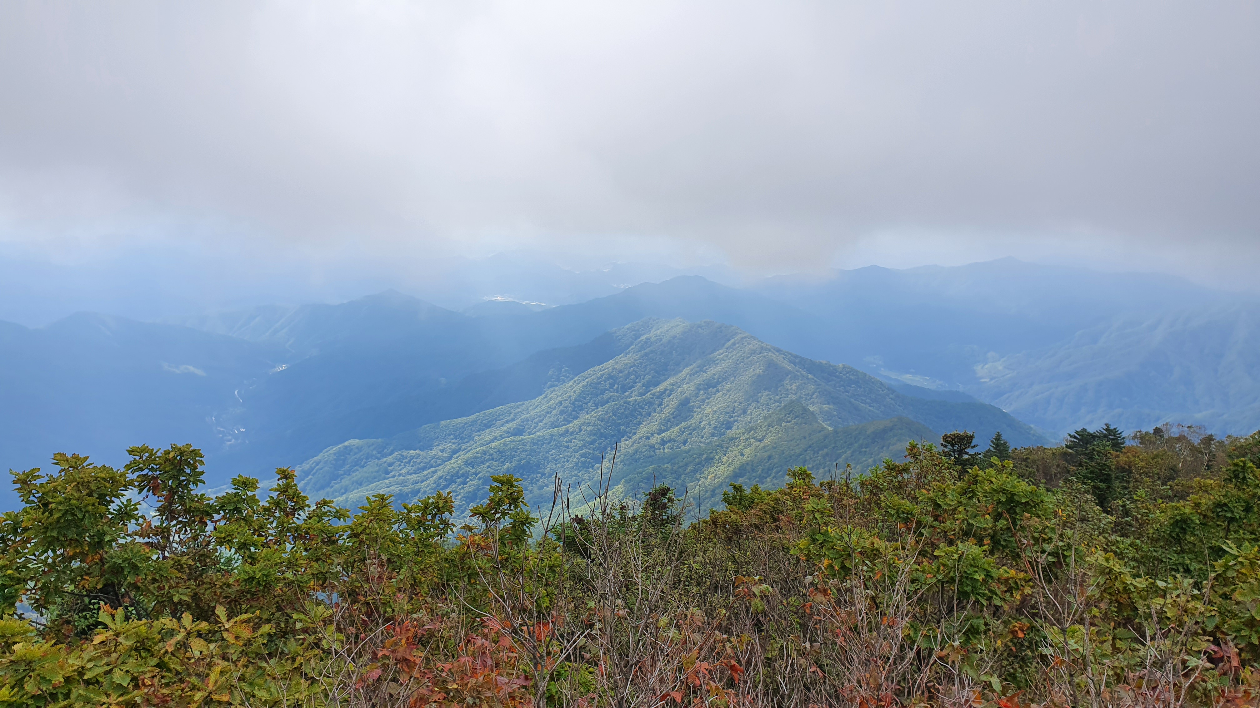 오늘 아침 6시 40분경에 등산배낭을 챙기고 차에 시동을 걸고 내비에 "화악터널 "을 치고 시내 고가도로로 올라가서 구리, 퇴계원을 지나 경춘가도로 기분 좋게 달려갔다. 가평읍내에서 391번 지방산악도로로 가다가 화악터널 못 미쳐서 2개의 공군부대 이정표삼거리에서 좌회전하여 산악도로로 한참 올라갔더니 넓은 사거리에서 우측에 군부대 바리케이드 문이 열려 있어서 꼬불 꼬불한 콘크리트 도로로 한참 올라갔더니 거의 산 정상(매봉 : 1,437m)으로 난 도로 끝까지 갔는데 군부대 정문이 나왔다. 군인이 나와서 여기는 군부대이고 화악산 정상은 아래 넓은 사거리 반대편으로 돌아가라고 알려 주어서 도로 1.5km 내려가서 넓은 사거리 주변에 9시 10분경에 주차해 놓고 반대편 도로로 걸어 올라갔다. 50m 정도 올라가니 바리케이드를 쳐놓은 길 옆쪽으로 들어가서 콘크리트 포장도로로 4km 정도 올라가니깐 화악산 정상이 아닌 중봉으로 올라가는 이정표가 나왔다. 화악산 정상에는 군부대가 있어서 출입금지로 대신 그 아래에 있는 중봉(1,446m)을 화악산 정상으로 인정해 주기 때문에 이정표대로 숲 속으로 들어가니 어제 비도 와서 습기도 많고 등산로가 거의 다 암반으로 되어있어 미끄러워서 조심에 조심을 하면서 0.4km 정도 올라가니 중봉 표지석이 있었다. 시간을 보니 10시 12분이었다. 중봉에서 주변을 보니 구름이 내려앉아 잘 보이지 않아서 4~5장 정도 사진을 찍고 바로 하산을 하여 주차장에 내려오니 11시 6분이었다. 차를 몰고 가평군 설악면에 있는 유명산 휴양림주차장으로 차를 몰았다.