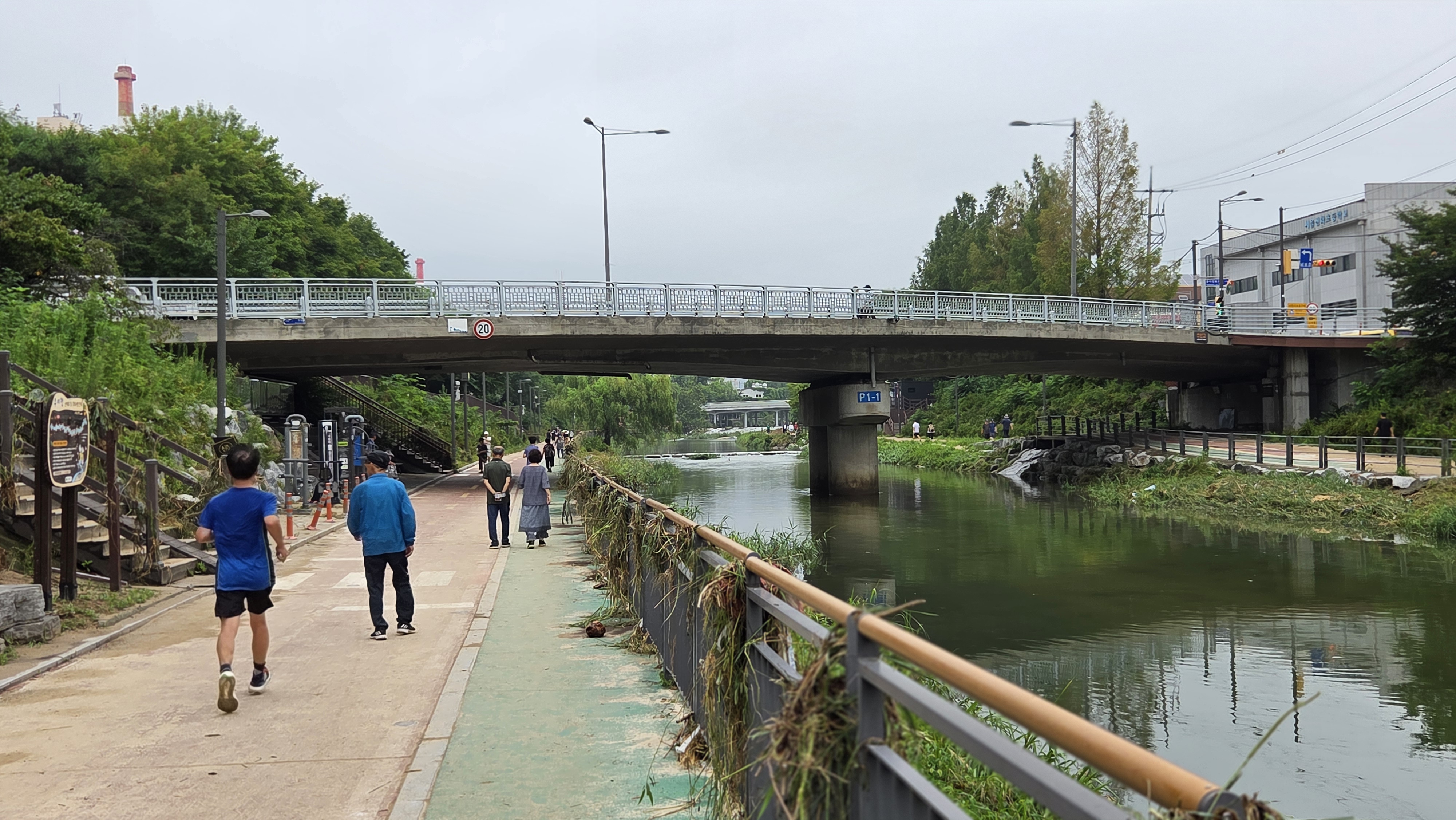 초안교, 그제 내린 비로 하천에 떠내려오다 산책로 난간에 걸린 잡초 또는 쓰레기들
