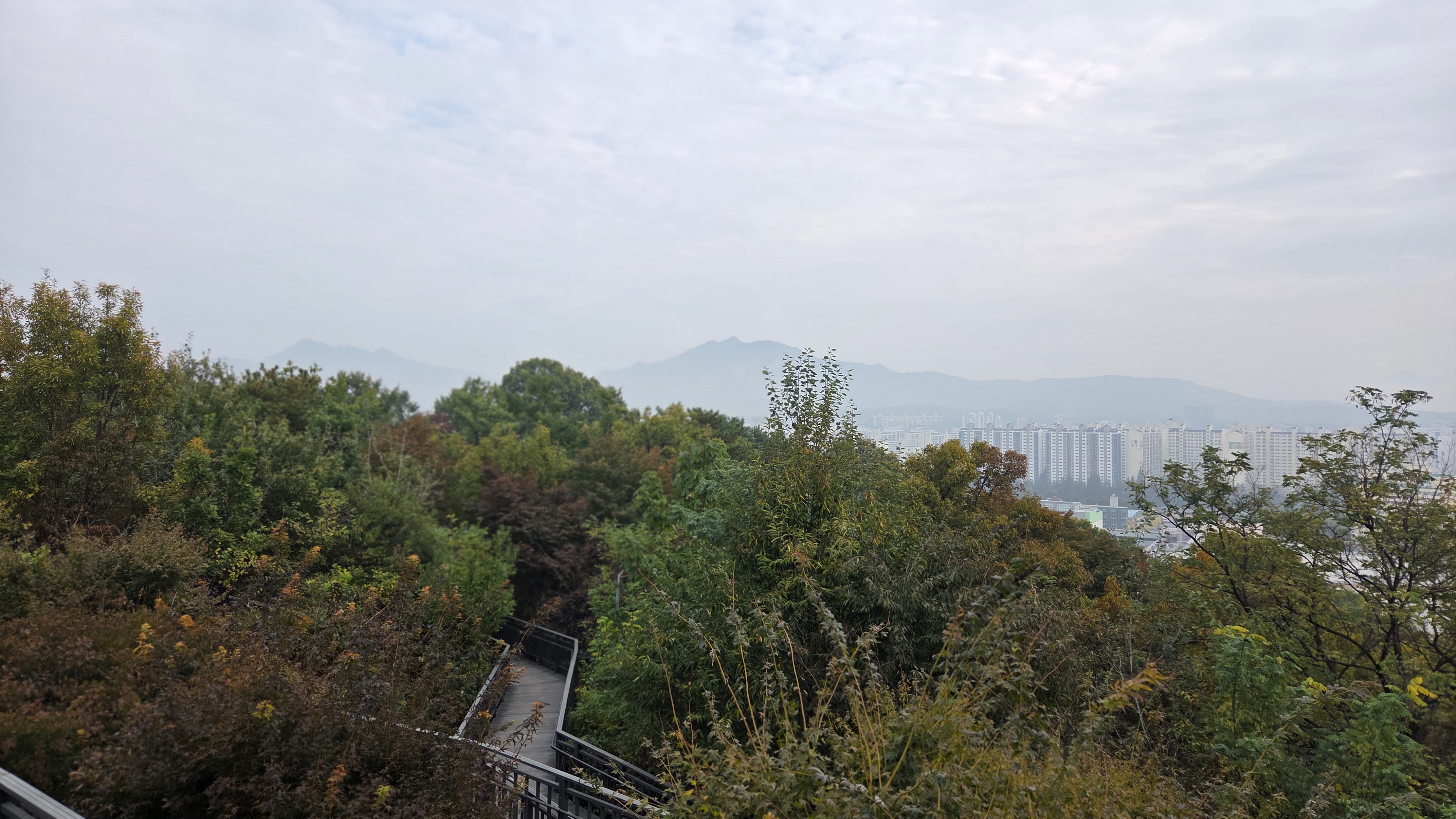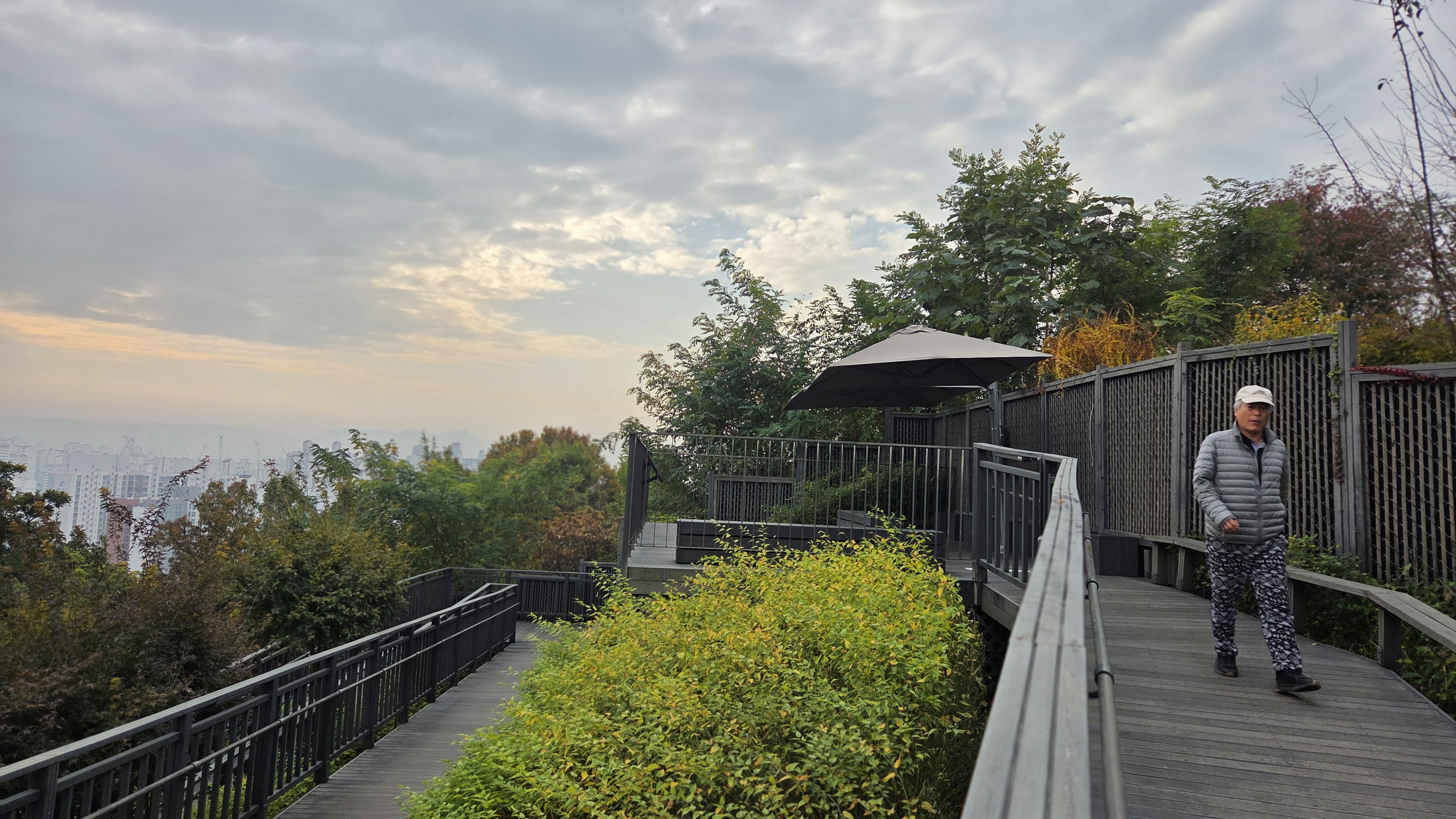 흐린 날씨 아침 8시 17분경에 아파트 북문으로 나가 광운초교 사거리-우이천 벼루말교를 지나 SK아파트뒤 영축산 서부등산로 데크출입구-유아숲체험장-데크둘레길 1km-영축산 전망대-데크둘레길 1km -광운대역 근처 등산로 출입구에서 유턴하여 데크둘레길 1km-영축산 전망대-데크둘레길 1km-인덕대 삼거리 등산로 출입구로 내려가서 월계로 1km-우이천 월계 2교 하상 산책로-벼루말교출입구-광운초교 사거리를 지나 우리 아파트 정원둘레길을 돌다가 9시 40분경에 우리 동으로 들어왔습니다.