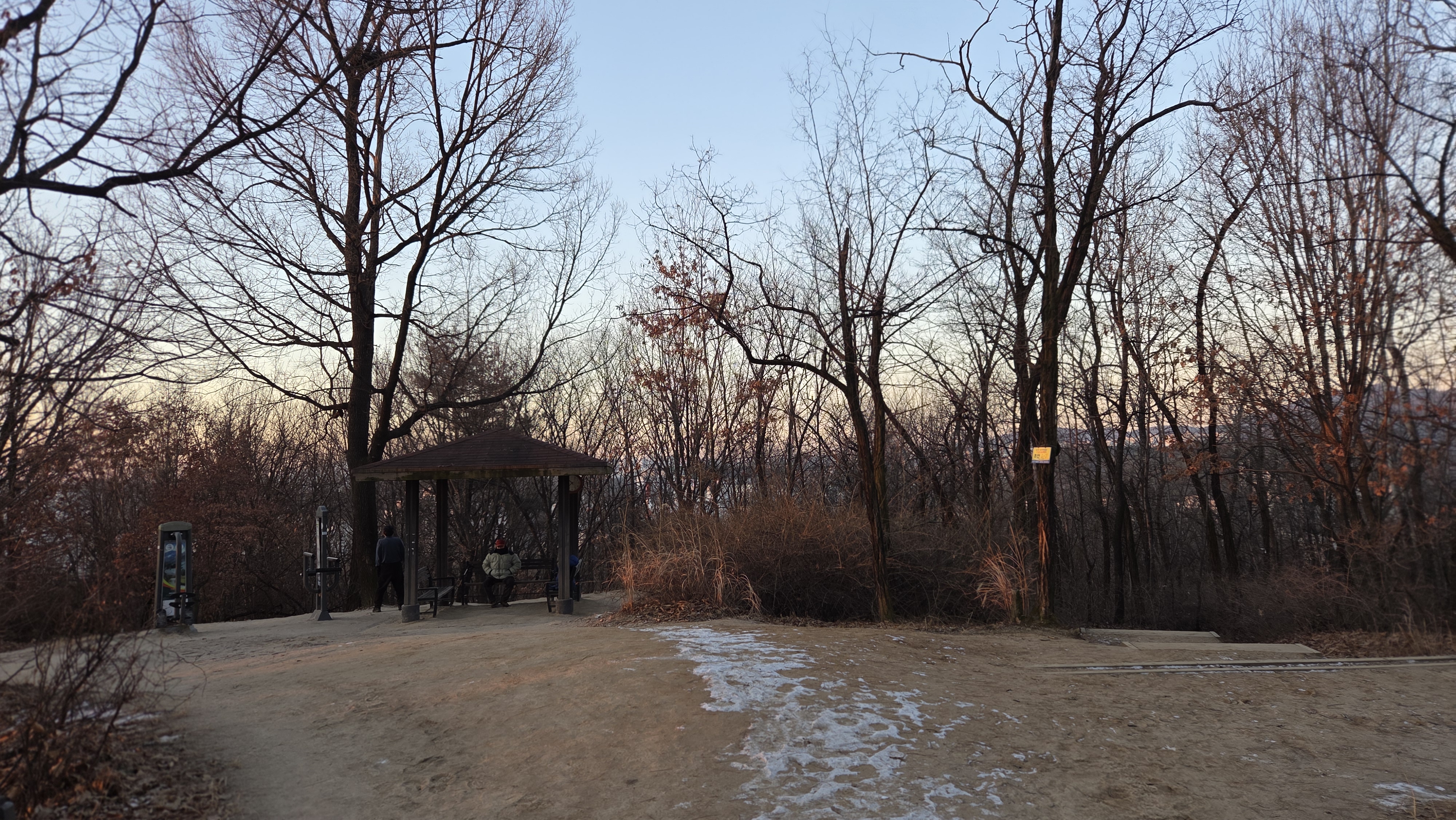 무지 추운 날(영하 12도) 아침 7시 24분경에 아파트 북문으로 나가서 우이천 월계 2교-돌징검다리를 건너 초안산 수국동산을 지나 둘레길-비석골공원-비석골 삼거리-체력삼거리-초안산 정상에 올랐다가 하산-체력삼거리-초안인조잔다 구장-초안산 터널-청백아파트-월계 2동 주민센터-월계주공아파트-월계2교 사거리를 지나 8시 44분경에 우리아파트 북문으로 들어왔습니다.