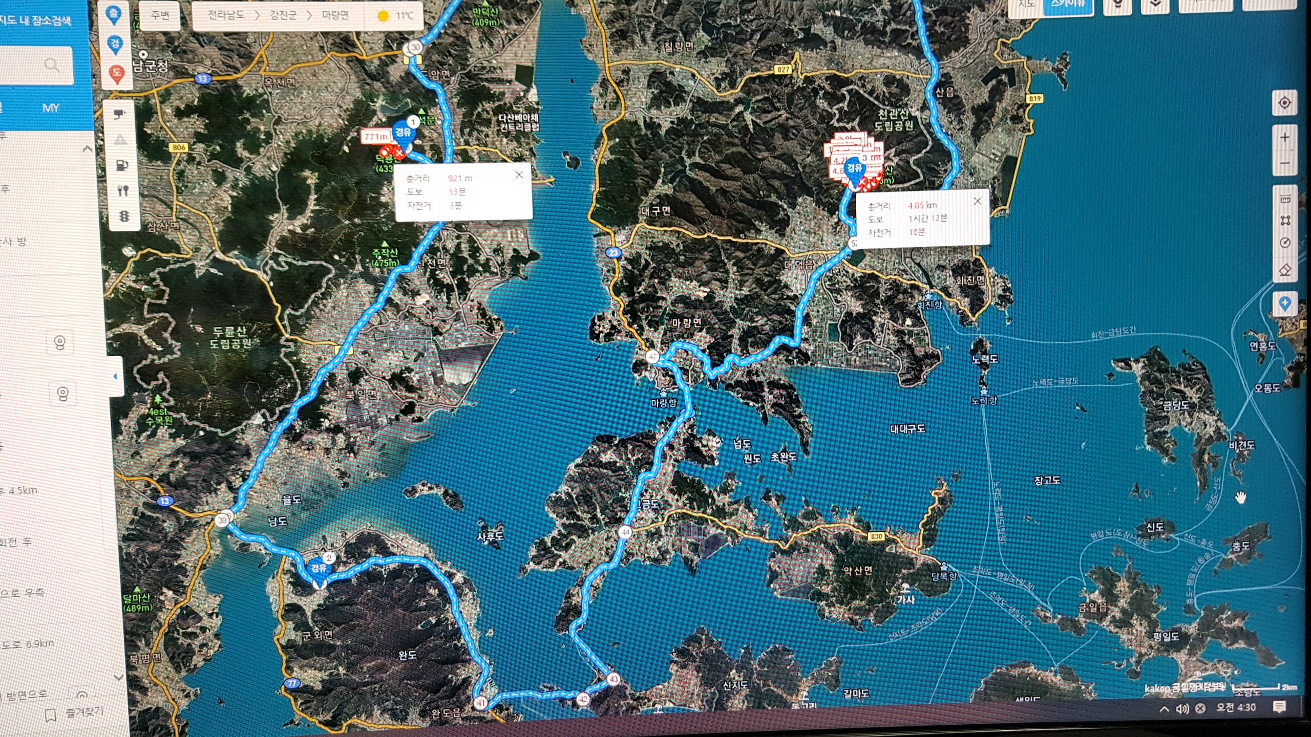 사방을 둘러보면서 사진에 담고 정상까지 올라온 코스가 하산코스라 동봉까지 올라갔다 내려갔다 3번 한 후 하산하다가 조리대 터널속 0.7km 정도 위치에 덕룡동굴표지판이 보여서 좌측으로 50m 정도 가보니 4~5m 정도 크기인 동굴이 있어서 안으로 들어가 보니 동굴 안 30m 정도가 보였다. 천정에서 물이 떨어지고 컴컴하고 무서워서 더 이상 들어가지 못하고 되돌아 나왔다. 오래된 표지판에 발굴중이라고 쓰여있었다. 만덕주차장으로 내려왔는데 만덕광업이 만덕산 암반을 깨서 골재를 만드는 회사같은데 등산로에 분진가루가 덮여 있었다. 차를 몰고 천관산으로 가야 하는데 강진만 때문에 직선으로 가는 도로는 없고 강진으로 돌아가야 하는데 여러 번 가봤기 때문에 가기 싫어서 새로 생긴 완도대교를 건너 고금도를 경우해서 천관산을 등산하기로 하였다. 완도로 돌아가는데 강진으로 가는 길보다 한 20km, 30분 정도 더 걸리는 것 같았다.