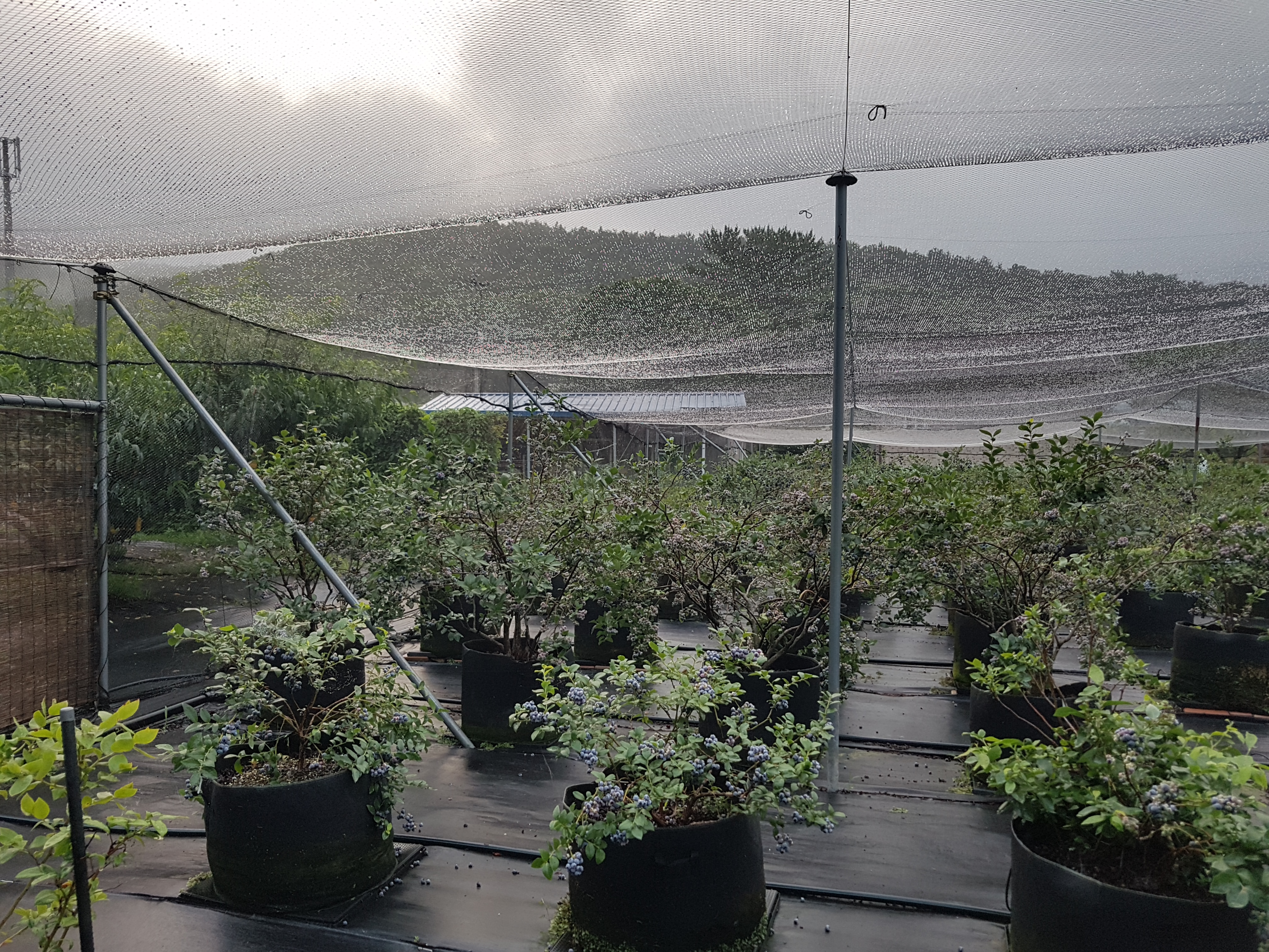 어젯밤과 오늘 새벽에 비가 내렸는데 2~3mm 정도 온 것 같습니다. 농장 한 바퀴 돌고 지붕 방조망에 맺인 빗방울이 예뼈서 농장 한바뀌사진을 찍어 보았습니다. 비가 2~3mm 정도 왔으면 베리 열매는 오전에는 물기가 있어서 못 따고 오후에나 따야 할 것 같습니다. 고춧대를 들고 농장 돌아다니면서 지붕 방조망에 맺인 빗방울을 전부 털어 주었습니다. 털어주다 보니 블루레이 밭에 파란 바구니에 반 정도 따놓은 블루베리 열매가 있었습니다. 나는 어제 그쪽으로 간 적이 없었으니 아내가 깜박 잊어먹었던 것 같습니다. 요즘 가끔 비가 자주 와서 주문량이 많이 밀리다 보니 비가 오지않은 날은 오후 2~3시까지 50kg 넘게 따서 선별작업과 포장을 해서 저녁 6시에 택배부치고 대전주변에는 직접 배달까지 해 주니 정말 쉬운 일은 아닙니다. 열매담긴 바구니를 들고 거실로 들어와 아내한테 보여주니 '에그머니 내가 그랬구먼!' 하면서 물에 씻어 거실에서 선풍기로 말린다고 하네요. 저도 그제 똑같은 짓을 했습니다. 부부동심 일체라고 할까요. ㅎㅎㅎ. 하긴 나이 70이 넘으면 기억력이 쇠퇴한다고 하는데 서서히 나타나는 것 같습니다. 뭐든지 암기하지 말고 적어둬야 할 때가 된 것 같네요.