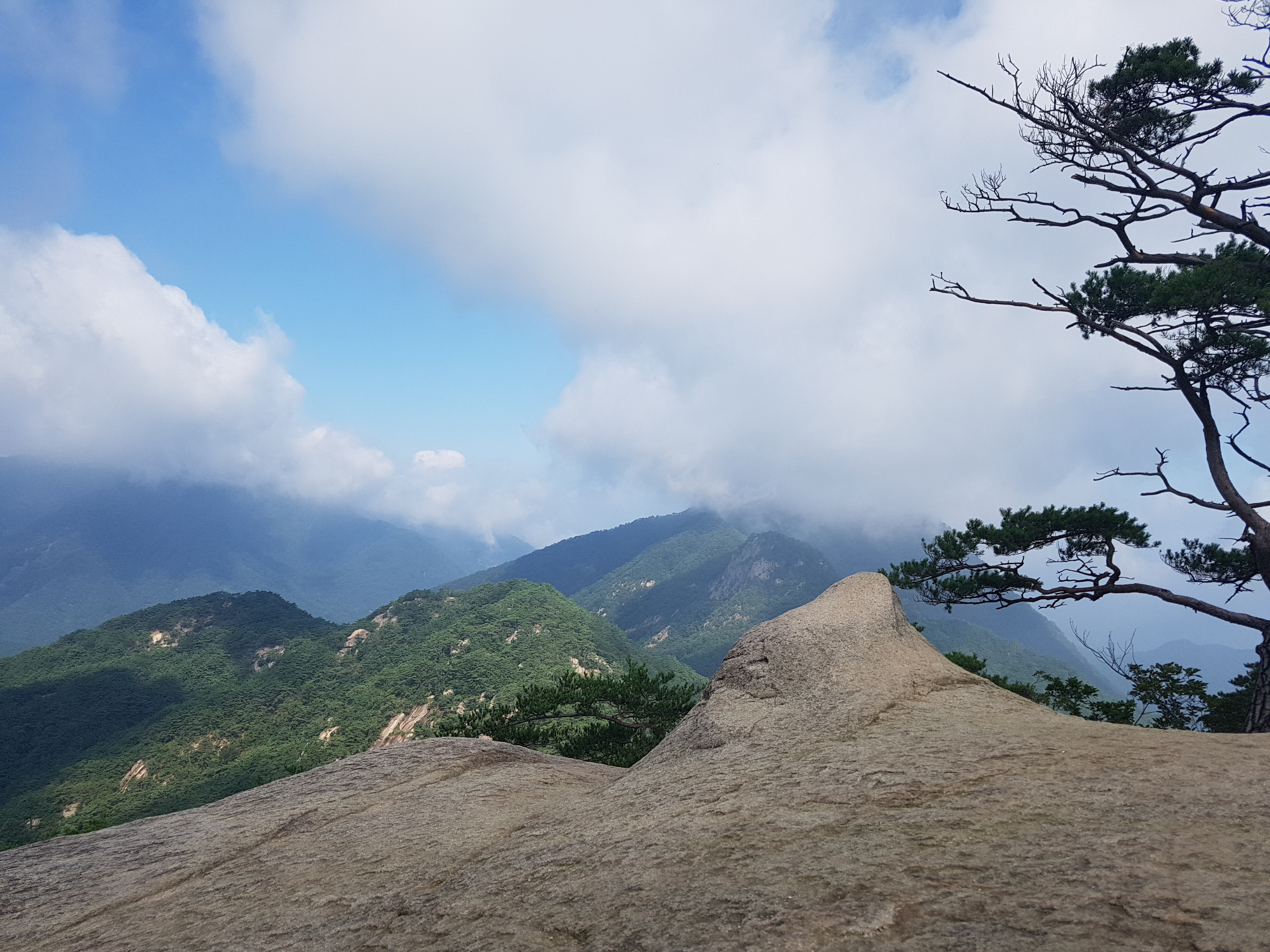 오늘 새벽 5시 반경에 식사를 하고, 등산 준비를 한 후에 6시 23분경에 애마를 몰고 동네를 나오는데 안개가 좀 껴서 해가 안 보이더니 연산천을 지나니깐 해가 구름 위로 솟아 올라왔습니다. 대전가는 국도와 대전외박 고속도로, 경부고속도로, 중부고속도로를 경유하여 증평-괴산 칠성면 국도를 타고 칠보산 입구에 있는 떡바위 펜션주변에 도착한 시간이 8시 25분 정도 되었습니다. 주차할 공간이 없어서 길가에 간신히 주차시키고, 블랙야크 100대 명산 중에 하난인 칠보산을 등산하기 시작하였습니다. 입구를 지나가니 쌍곡하천을 건너는 목제철제 다리를 지나 우거진 나무숲으로 무수암골 쪽으로 50분 정도 올라가니깐 각연사고개에 다 달았습니다. 고개에서 우측으로 능선을 타고 한 20분 정도 올라가면서 주변 산들이 잘 보였는데 소나무들이 울창하게 잘 자랐고 사이사이로 암벽들이 보였고 긴 계단을 올라가니 칠보산 정상(충북, 778m)에 도착하였습니다. 주변에 있는 군자산, 보배산, 시루봉, 악휘봉들이 구름에 가려 잘 보이지 않았습니다. 정상에서 몇장 사진을 찍고 땀닦고, 정상을 넘어 15분 정도 하산을 하다 보니 각연사와 쌍곡폭포로 가는 삼거리가 나와서 쌍곡폭포쪽으로 숲길을 내려오면서 계곡을 두 번 정도 건너갔다 왔다를 반복하면서 1시간 정도 내려오니깐 계곡길 옆에 쌍곡폭포가 있는데 장마때 비가 많이 와서 폭포에 물이 많아 물소리가 많이 났습니다. 쌍곡계곡을 따라 내려오니 절말동네에 도착하여 국도옆 쌍곡계곡을 구경하면서 1.2km를 걸어가니깐 애마가 있는 곳에 도착(11시 35분)하였습니다. 칠보산 등산을 마치고, 오후에 경북 조령산을 등산하기 위해서 23km 정도 떨어져 있는 이화령으로 애마를 몰았습니다.