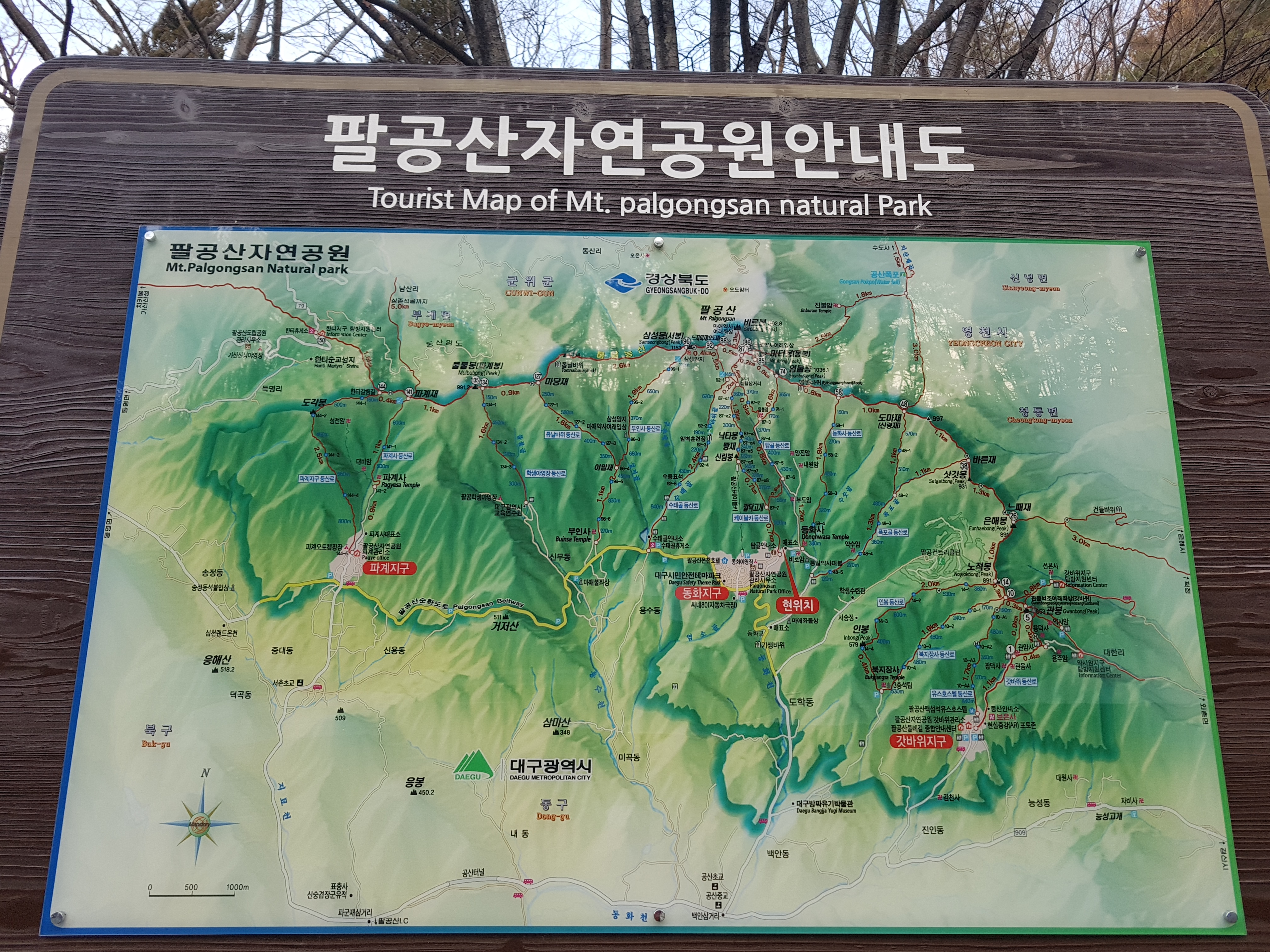 원래 오늘 등산계획은 오후에 김천 화악산까지 등산할 예정이었으나 아직도 주차해 놓은 곳까지 가려면 2시간 정도 걸릴 것 같아서 화악산 등산은 다음으로 미루고 천천히 등산하기로 마음 먹었습니다. 한참 걸어서 12시 6분에 낙타봉에 올랐습니다. 낙타봉에서 0.6km 정도 아래로 내려갔다가 다시 앞산을 올라갔더니 케이블카봉인 신림봉에 도착하였습니다. 일단 봉우리에서 팔공산전경이 잘 보여서 사진을 찍고 휴게소에 들어가서 등산로를 보니 주차장까지 1.6km 정도 내려가야하는데 다리가 풀리고 힘도 들고 케이블카도 타고싶어서 편도티켓을 물어보니 노인은 6,000원이라고 해서 티켓을 구입하였습니다. 케이블카를 타고 내려와서 0.6km 정도 자연공원동네를 관광하면서 주차해 놓은 곳(12시 52분)으로 와서 차속에서 아내에게 등산사진을 보내고 점심먹고 바로 집으로 간다고 알려주었습니다. 점심을 먹고 네비를 찍었는데 들어 올때의 코스가 아닌 팔공산 서쪽인 수태골-파계사-다부를 지나 생전 처음가는 길로 갔더니 구미공단으로 낙동강대교를 건너 남구미 IC로 들어가서 경부-대전남부순환도로를 경유해서 집에 오후 4시 10분경에 도착하였습니다.