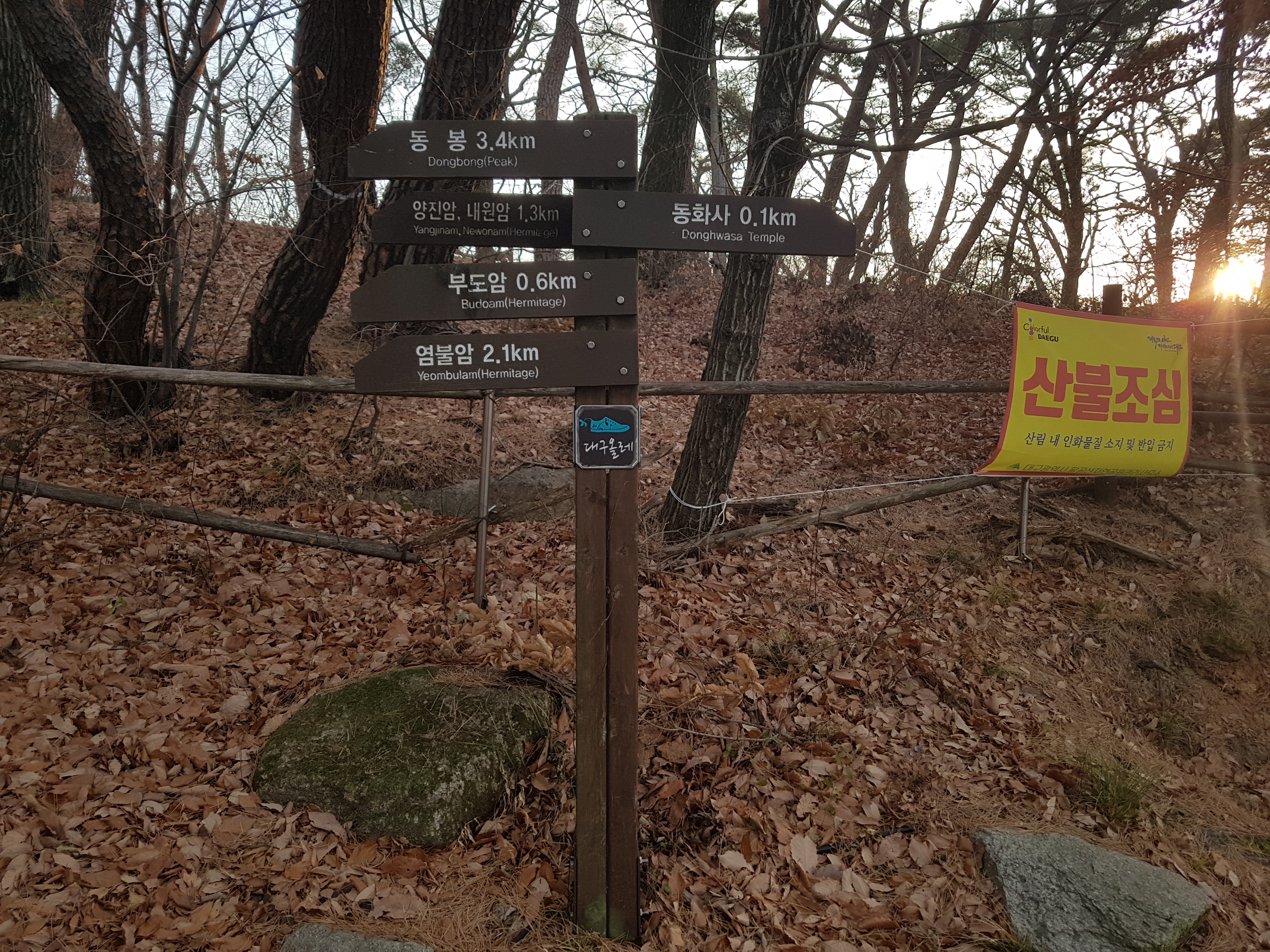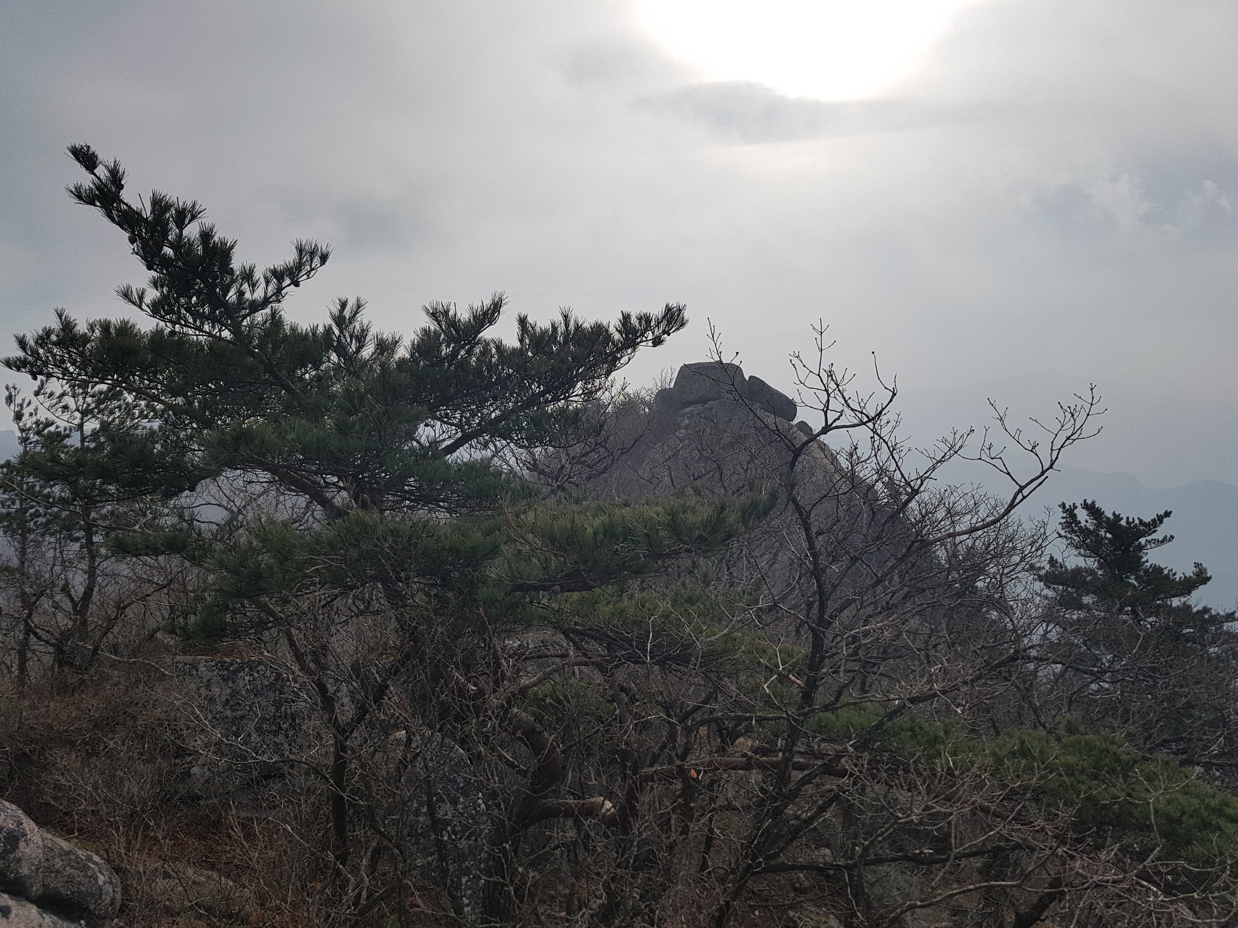 새벽 5시 22분에 집을 출발해서 오전 7시 50분경에 동화사 집단시설지구에 도착하여 동네구경을 한 후 8시 8분에 팔공산 분수대광장에 있는 팔공산 자연공원 안내도에서 오늘 오전에 팔공산을 등산할 등산로를 살펴보고 차를 라데팡스 옆 빈터에 세웠습니다. 등산 준비를 마친 후 배냥을 메고 동화사 출입문을 지나 동화사주차장옆을 지나 동화사를 구경하고 도로 나와서 이정표대로 0.6km 부도암, 1.3km 내원암옆을 지나 양진암옆 골짜기를 타고 능선으로 올라갔습니다. 능선을 올라가다 병풍바위 사이로 올라가 염불봉(1,036.1m)을 지나 미타봉인 동봉(1,170m)에 올랐습니다. 동봉에서 사진을 찍고, 0.2km 가서 삼거리 위로 많은 철탑사이로 올라가니 팔공산 비로봉(1,192m)에 도착(10시 30분)하였습니다. 정상에 구름이 끼고 세찬 바람이 불어서 이슬이 바위에 부딪치면서 눈 온 것같이 하얗게 보였습니다. 정상날씨가 무지 추운데 몸에는 땀이 많이 났다가 식으니깐 몸이 덜덜 떨렸습니다. 정상에서 사진을 찍고 추워서 더 있을 수가 없어서 0.7km 서쪽으로 떨어져 있는 서봉으로 출발하였습니다. 정상밑 삼거리에서 서쪽으로 0.7km가는데 너덜지대와 목재계단,평지를 지나서 11시 6분에 삼성봉인 서봉(1,170m)에 올랐습니다. 서봉에서 여러 사진을 찍고 하산하려고 하는데 서봉으로 올라오는 일행이 있어서 케이블카봉으로 가는 길을 물었더니 온 길로 갔다가 수태골로 내려가는 방향으로 가다가 철답사거리에서 직선길로 가다가 낙타봉을 넘어가면 케이블카봉이 보인다고 했습니다.