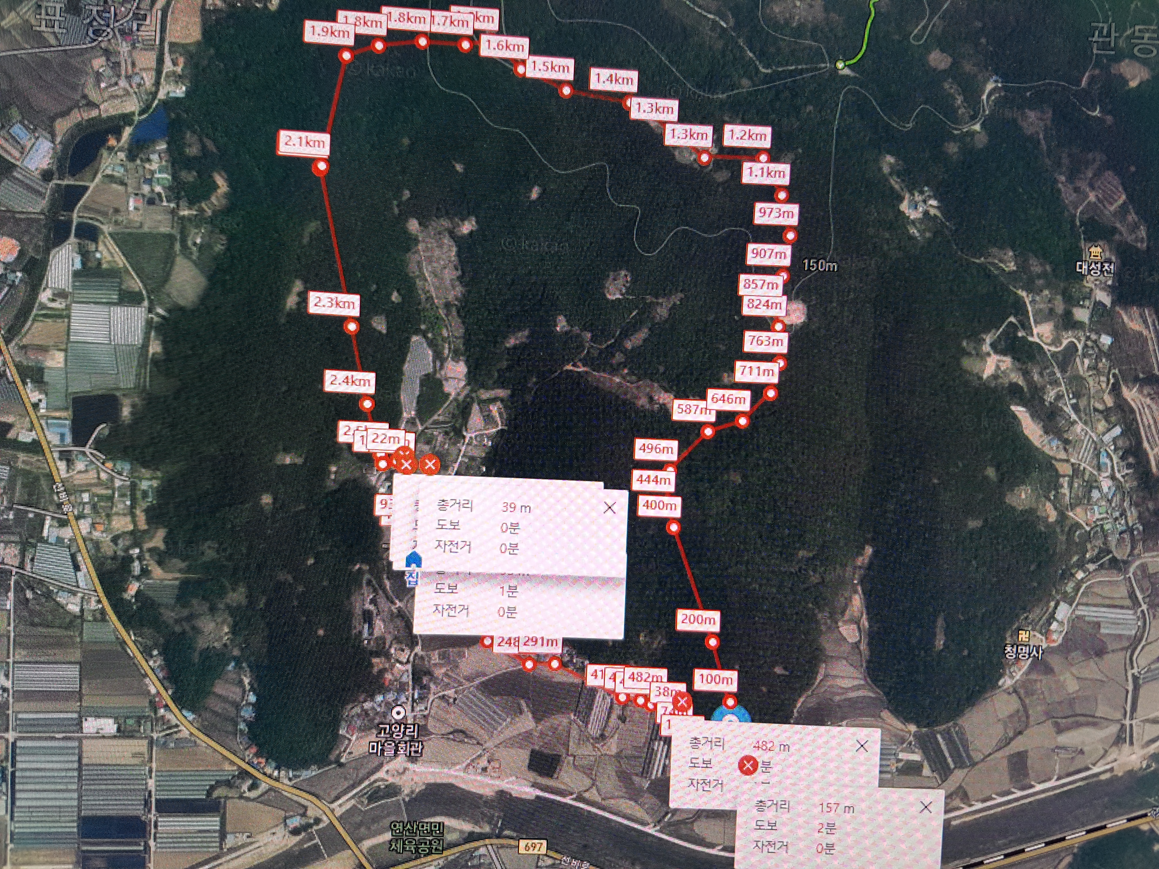 아내와 같이 걷기운동을 하려고 해도 나는 빠르게 걷던지 아니면 조깅하는 것을 좋아하는 반면에 아내는 보통 걷기를 좋아해서 서로 보폭이 맞지않아 아내와함께 걷기운동을 잘 안 하였다. 그래서 아내와함께 운동할 수 있는 방법을 생각해본 결과 우리마을 1반 앞길을 지나 뒷산을 산책하면 좋을 것 같은 생각이 들어서 지도상으로 산책코스를 정하고 도상거리를 측정해 봤더니 약 4km정도 되어 산책거리로는 딱 좋은 거리인 것 같다. 우선 나 혼자 답사해 보고 좋으면 아내한테 협의할 예정이다.