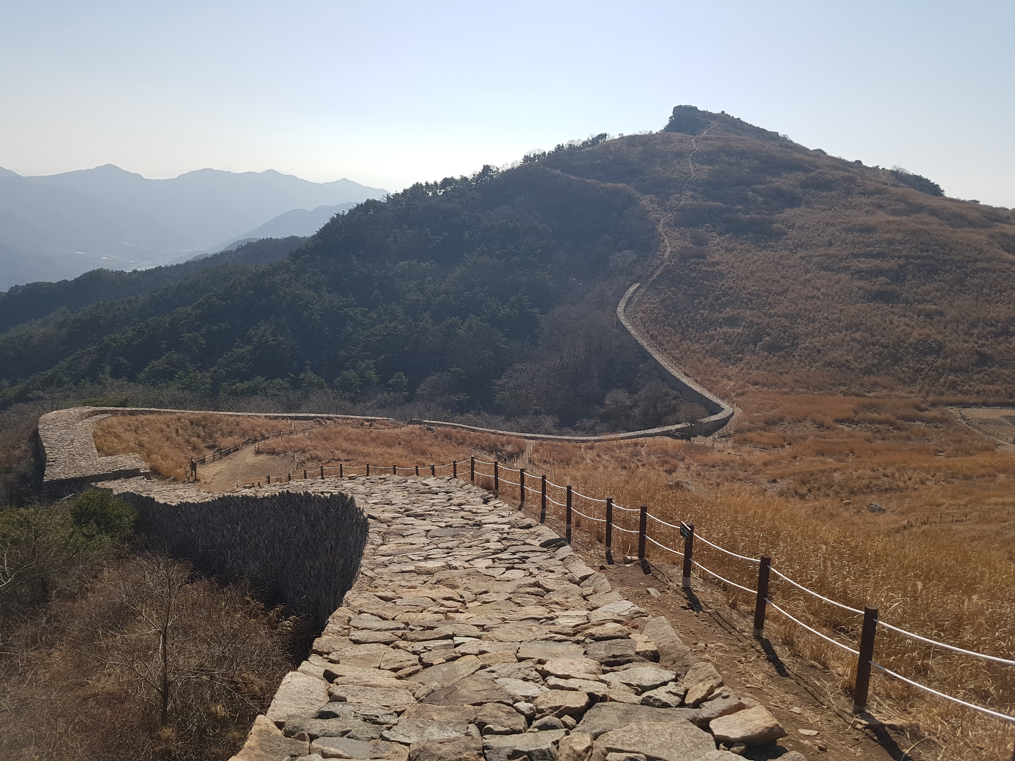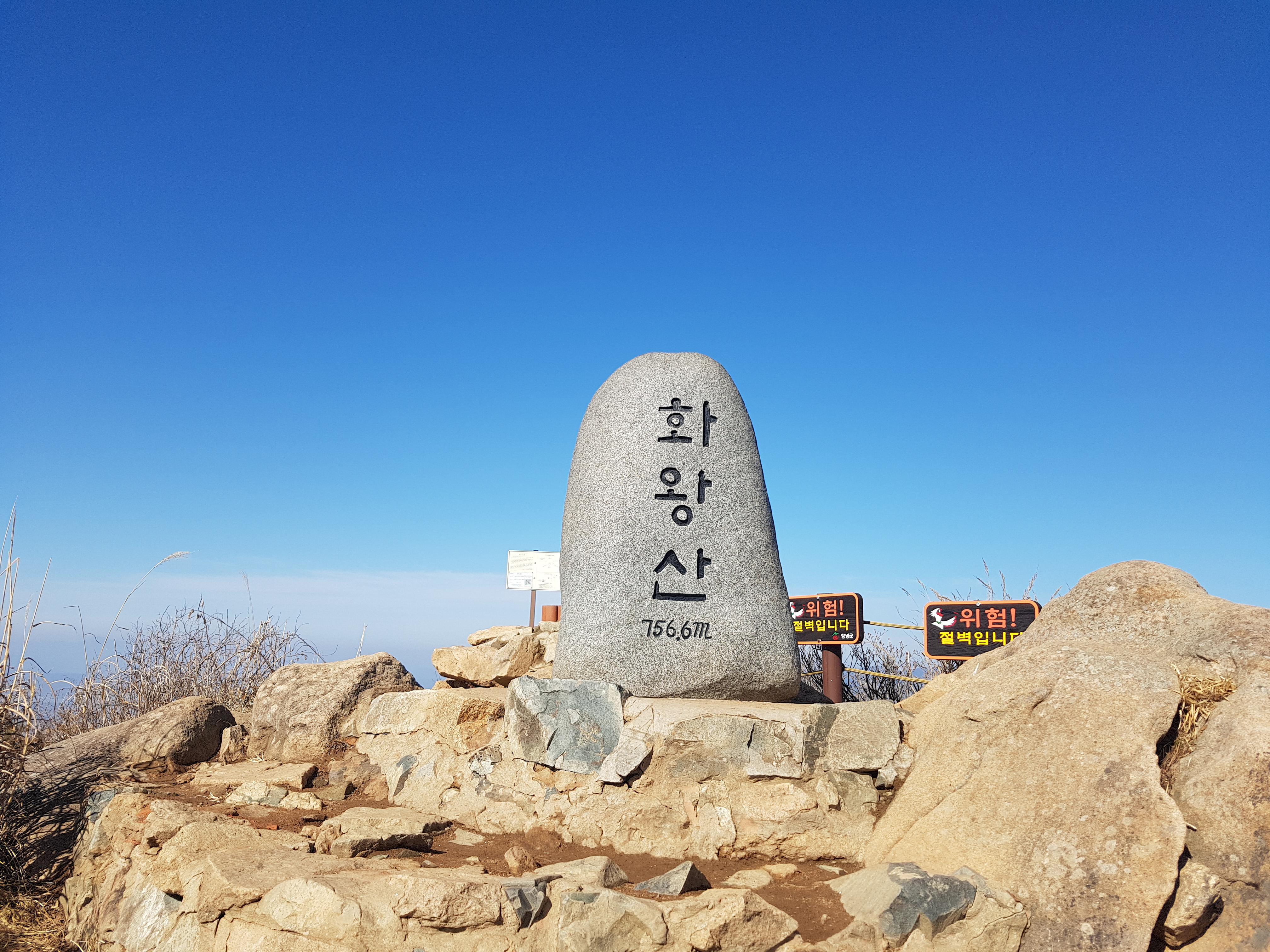 오전 10시 52분에 무학산 백운사주차장을 출발해서 창원시내를 지나서 내륙고속도로를 경유하여 창녕 화왕산 도성암주차장에 12시에 파킹하였다. 12시 5분경에 등산준비를 마치고 화왕산을 등산하기 시작하였다. 포장도로옆 목재길로 올라가니 산비탈면위에 도성암이 있는데 내려올 때 보기로 하고, 등산코스가 3개 코스가 있는데 가운데 있는 2코스를 선택하여 올라가는데 정상까지는 2km가 되는데 산 전체가 암반이고 골짜기를 오르는데 돌계단으로 가파르게 설치되어 있어 쉽지가 않다. 쉬지않고 천천히 올라갔더니 오후 1시 1분경에 화왕산성 서문에 도착하였다. 산성터가 6만평 정도되는 것 같는데 3년마다 억새를 태워서 그런지 억새밑에 흙이 까맣게 보였고, 6만평에 난 가을억새는 볼만할 것 같다. 산성터가 비교적 보전이 잘 되어 있어서 70%는 보수를 하였고 앞으로 계속 보수한다고 한다. 우측으로 300m 정도 올라가니 화왕산 정상(757m)에 올랐다. 정상에서 주변사진을 찍고 성곽길이가 2km 되는 것 같은데 시간 여유가 좀 있어서 성곽반정도는 기념될만한 곳이 있어서 돌아보기로 하였다.