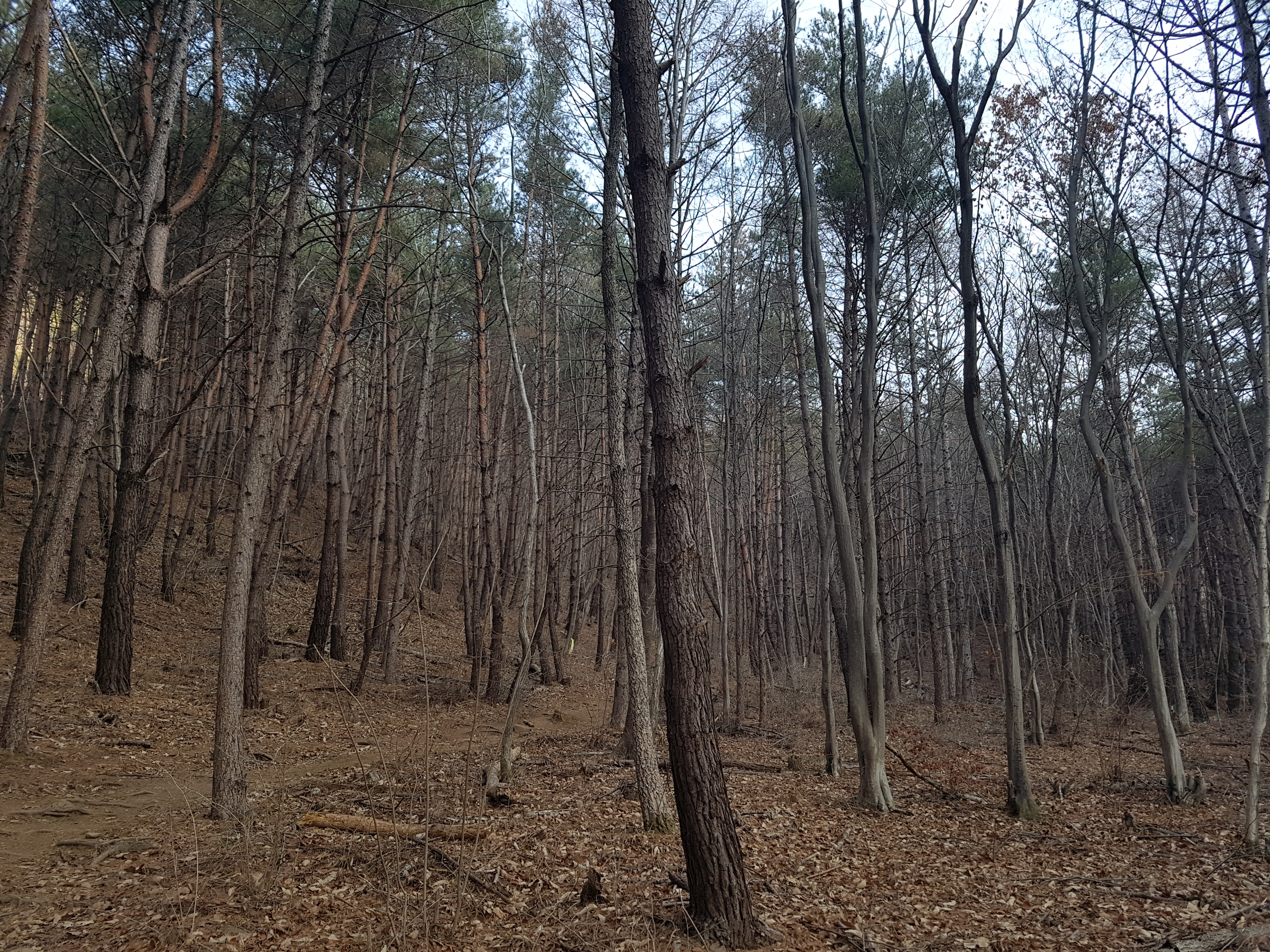 새벽에 일찍 일어나 아침을 먹고 아내가 싸 준 점심 도시락을 배낭에 넣고 오전 5시 30분에 차를 몰고 대전 국도를 지나 서대전에서 대전 순환-경부-대구 밀양 고속도로를 경유하여 삼양리 금성농원 옆에 등산로 입구에다 8시 25분에 주차를 시켰다. 등산 준비를 마치고 바로 나무가 우겨진 숲으로 들어가서 먼저 밀양 군립공원 운문산(1,188m)을 등산하려면 아랫재(해발 750m)까지 1.8km를 올라가야 하는데 비교적 등산로가 좋아 천천히 올라갔다. 9시경에 아랫재 사거리에 도착해서 물을 마시고 왼쪽에 급경사 등산로로 1.5km 올라가면 운문산 정상에 도착할 것 같다. 급경사는 목재철계단을 설치하였지만 몇개 안 되고 자연 급경사에 지반이 질어서 올라가는데 애를 먹었다. 완만한 경사에 있는 등산로는 오솔길같이 좋은 곳도 있지만 질은 곳이 더 많았다. 그런 코스를 지나 9시 57분에 운문산 정상(1,188m)에 올랐다. 정상에서 주변을 보니 엷은 안개가 끼여 잘 보이지 않았지만 주변 사진을 몇 장 찍었고, 특히 정상 옆에 20년 정도 자란 소나무가 있어서 멋진 사진를 찍었다. 바람도 많이 불지만 오늘 가지산도 등산해야하고 얼음골도 가야하기 때문에 서둘러 아랫재까지 내려왔더니 10시 36분이 되었다. 아랫재에서 가지산을 등산하려면 운문산으로 올라가는 반대편 등산로로 가야 한다. 물 좀 먹고 소변도 보고 재정비한 후에 가지산으로 출발하였다.