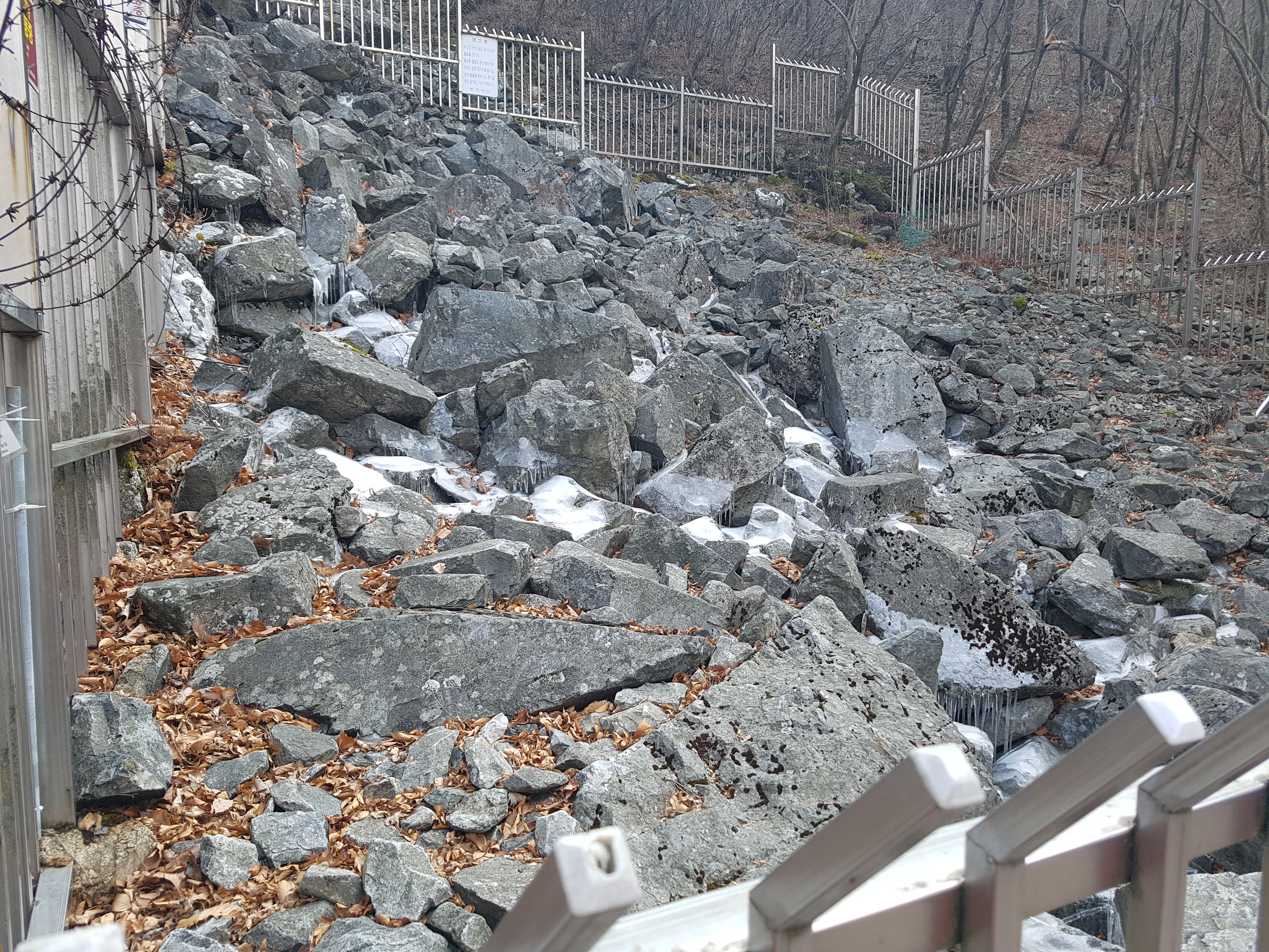 운문산(1,188m)과 가지산(1,241m)을 등산하고 주차장으로 내려와서 오후 2시 40분 경에 차를 몰고 밀양 천황사와 얼음골 주차장에 오후 3시경에 도착하였다. 관광준비를 한 후에 제2주차장으로 내려가서 철교를 건너 길을 쫒아 올라가니 매표소가 나와서 얼음골 입장료가 1,000원이었다. 70세 된 노인이라 말씀드렸더니 그냥 올라가라고 해서 고맙다고 말씀드리고 천황사와 얼음골 올라가는 길로 올라가는데 옆에 산장이 있고 200m 더 올라가니 아담한 천황사가 나왔다. 문을 닫여있어서 겉으로만 3채 구경하고 나와서 옆으로 구름철교를 지난 200m위로 목재계단을 밟고 올라가니 얼음골이 나왔다. 20m되는 사각형터에 큰돌로 메워져있는 틈사이로 고드름이 한 20개정도 달려있고 날씨가 더워 근처에는 눈이나 얼음이 없는데 이 얼음골에만 얼음이 많이 있었다. 돌틈사이로 찬공기가 나오면서 생긴 얼음으로 생각된다. 그 외는 볼 것이 없어서 급히 주차장으로 내려왔더니 한 15분정도 걸린 것 같았다. 주차장에서 높은 산을 보니 케이불카가 있는데 얼음골 주차장옆에서 앞산이 높은데 그 중턱까지 왕복 운행하는 것 같았다. 2주후에 재약산을 등산해야하는데 여기서 걸어갈려면 너무 멀어서 케이블카타고 가서 등산하는 것이 좋다고들 하기 때문에 팔공산은 편도로만 탔는데 여긴 왕복티켓이라고 한다. 주차장에 가서 차를 몰고 집으로 떠났는데 집에 도착하니 오후 6시 30분이 되었다.