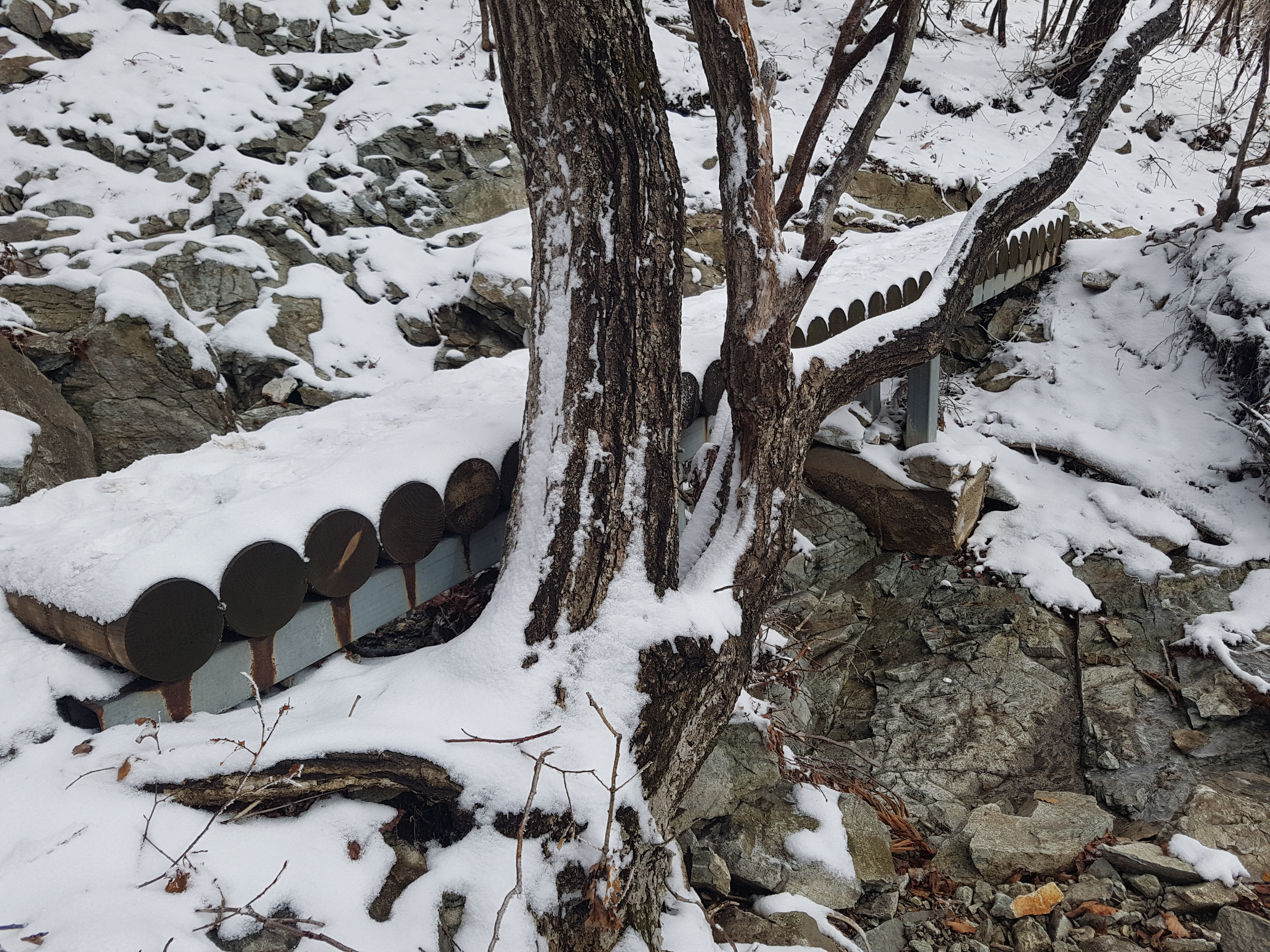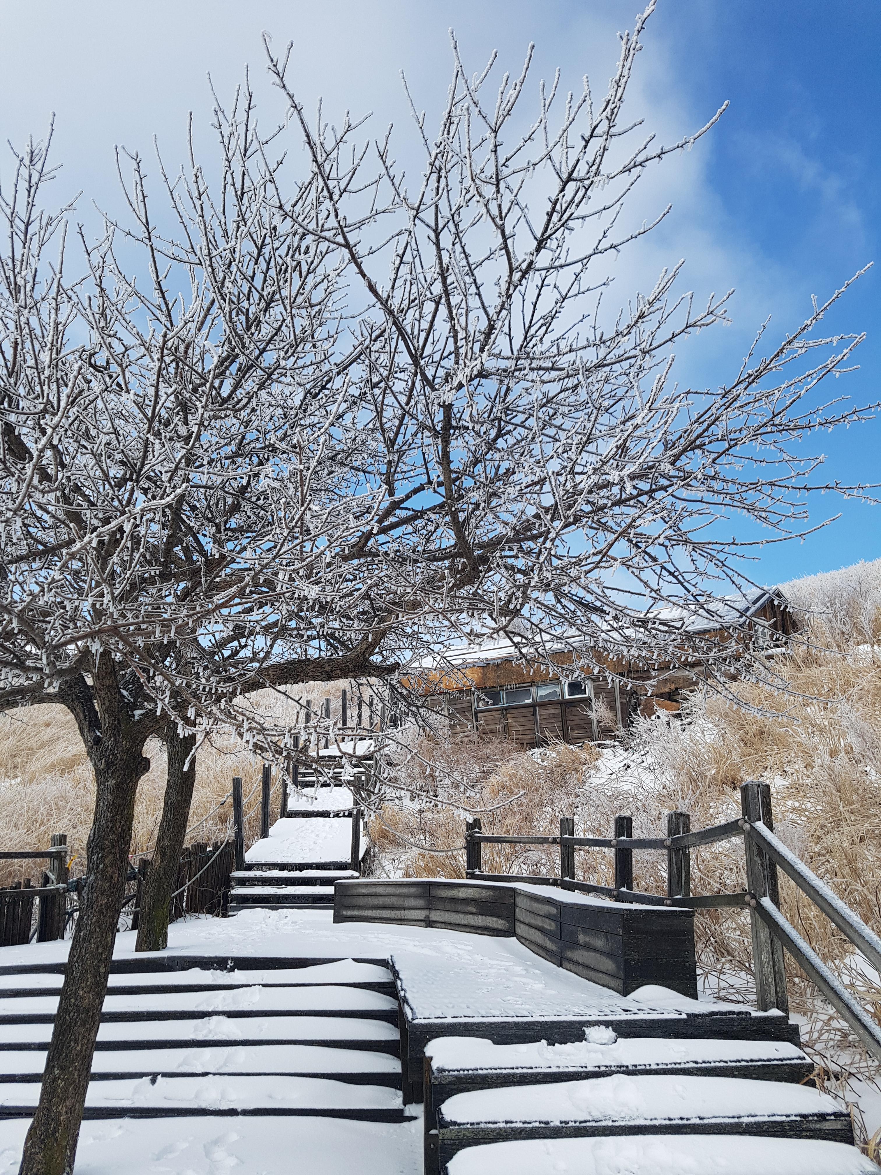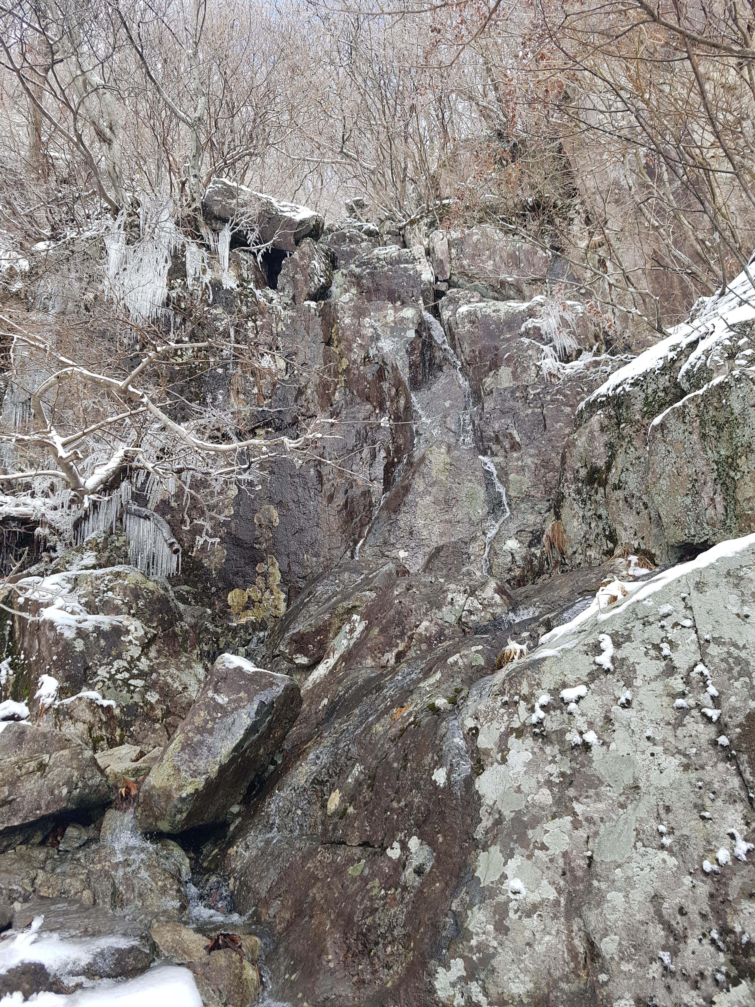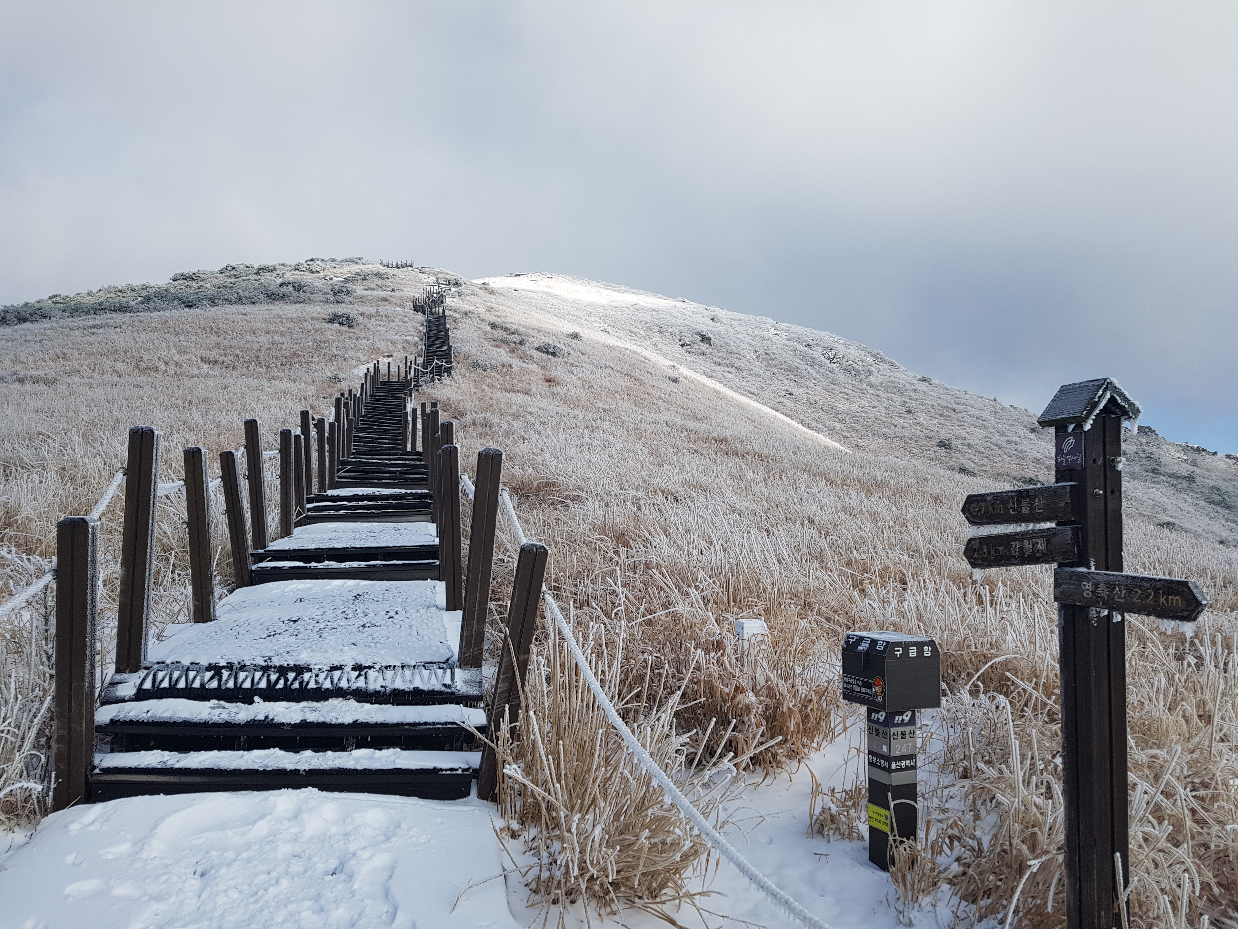 오늘 등산할 곳은 울산 신불산(1,209m)과 경남 밀양 재약산(1,119m)인데 산이 높고 집에서 거리도 멀고 재약산은 등산코스 중에 케이블카를 타야 되고, 높은 천황산(1,159m)이 옆에 있어서 시간이 되면 가 보고 싶어서 아내한테 새벽 5시반에 집에서 출발할 예정이라고 말했더니 아내가 일찍 일어나 모든 준비를 해 주었다. 아침식사를 한 후에 5시 20분경에 주차장에서 차를 빼고 차고문을 닫고, 5시 24분에 신불산 내비를 찍고 국도 2개와 고속도로 3개를 지나 신불산 아래에 있는 건암사 주변 길가에 차를 파킹 하였다. 삼남읍 시내 길에서 산을 쳐다보니 그제 내린 눈이 산을 덮여 엄청 웅장하게 보였다. 우리 지역은 어제 비가 왔는데 영동지방 이상은 20cm이상 눈이 왔다고 하고 영동이하 지방은 비가 내렸다고 해서 집에서 출발할 때 아이징을 가져갈까 망설이다가 잊어먹고 그냥 왔기 때문에 몹시 걱정이 들었다. 등산 준비를 마치고 큰길로 올라갔더니 건암사 입구에 등산입구가 있어서 울창한 소나무 밑으로 만들어 놓은 등산길로 올라갔다. 옆 경사로 0.3km 정도 가서 골짜기를 건너 골짜기를 끼고 산을 올라갔다. 눈이 5cm 정도 내린 것 같은데 한참 갈지자형 길을 계속 올라가 얼음골을 지나 이름 없는 폭포를 지나고 한참 올라가다 보니 목재계단이 나오고 간이 휴게소가 있는데 평일이라 문이 닫혀있었다. 더 올라가니 신불산 억새공원 사거리가 나왔다.