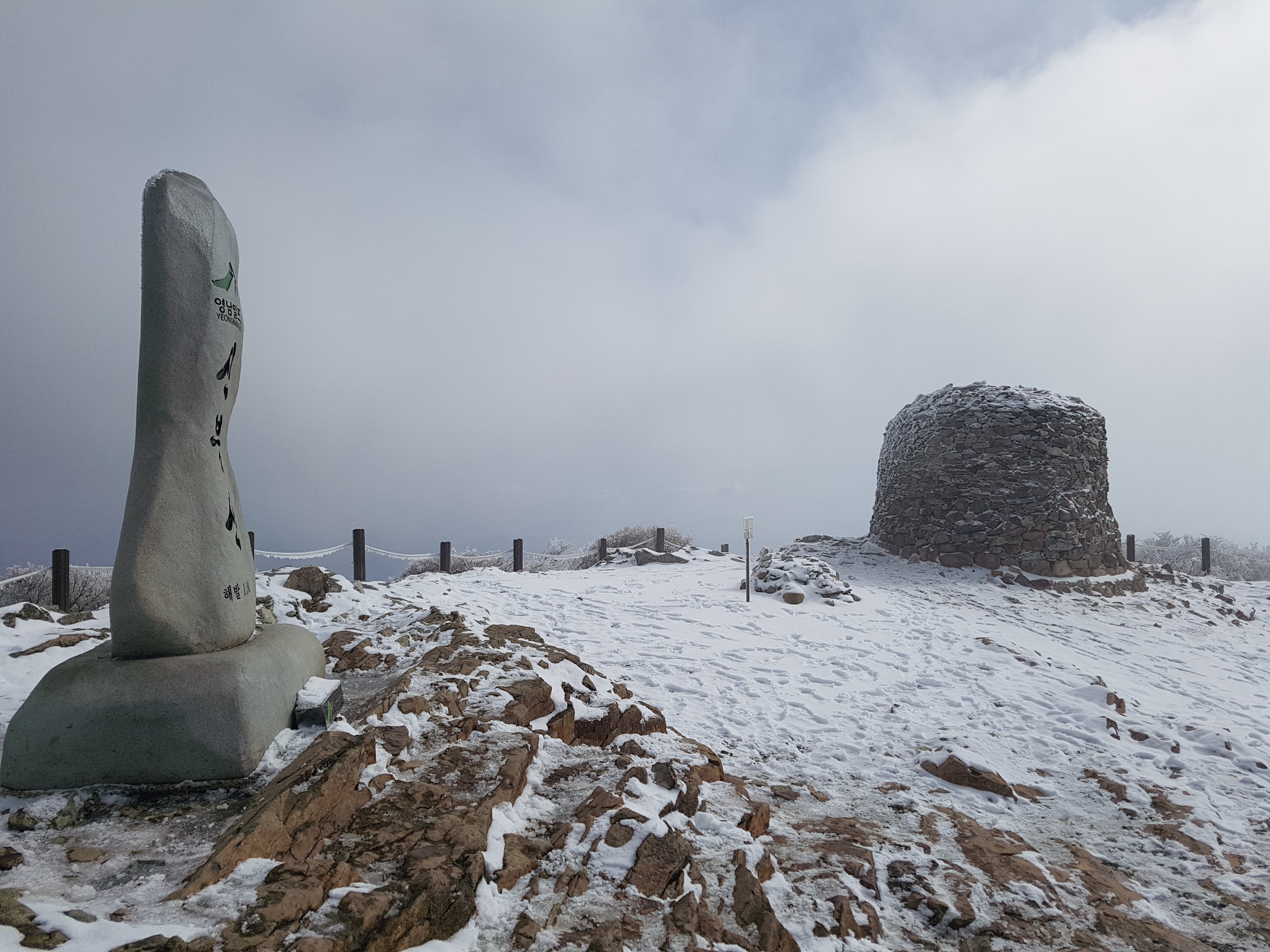좌측으로는 2.2km위치에 영취산이 있고 오른쪽으로 0.5km를 반 정도 목재계단을 올라가면 신불산 정상이 나온다는 이정표가 보였다. 억새 공원에는 싸리나무들이 비 눈으로 덮여있어서 햇빛에 빛을 발하는데 장관이었다. 오른쪽으로 목재계단을 올라가다가 바위로 올라가는데 눈과 어름이 있어서 미끄어져 무지 힘드는데 내려올 때는 조심해야 할 것 같았다. 10시 정각에 신불산(1,209m) 정상에 올라갔는데 습해서 그런지 핸드폰에 시간이 잘 안 보였다. 정상까지 1시간 반 정도 잡았는데 억지로 본 시간이 두 시간 걸릴 것 같아서 나머지 등산할 곳이 많아서 다 못할 것 같아서 원점회귀라서 아주 빠른 걸음으로 올라왔던 등산길을 쉬지않고 내려와서 시간을 보니 오전 11시 5분 정도 되었고 전체 3시간이 걸렸다. 승용차 속에서 아내가 싸준 김밥을 먹으면서 차를 몰아 두 번째 등산할 얼음골 케이블카 주차장으로 차를 몰았다.
