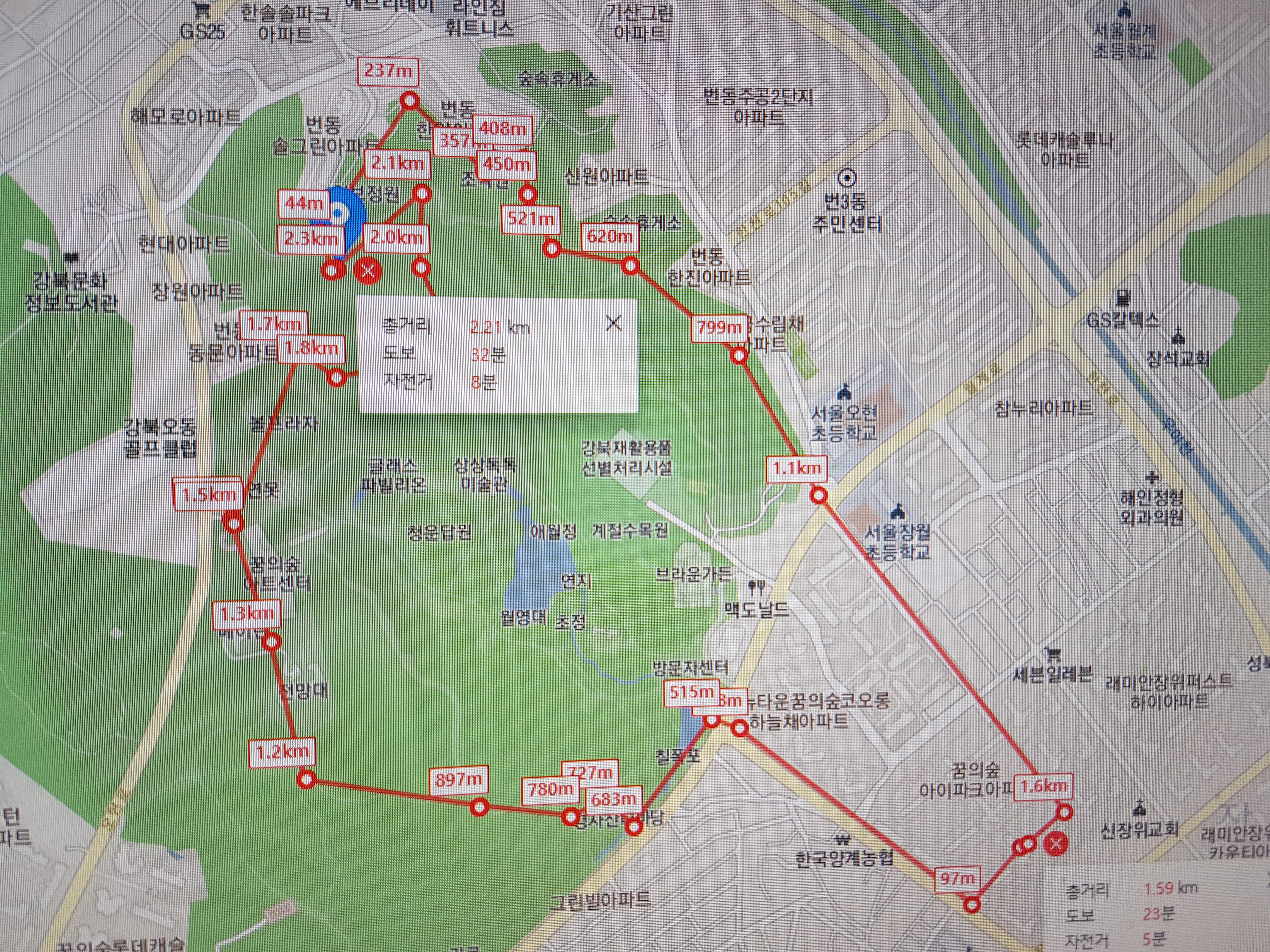 6시 반경 아침식사를 한 후에 7시 10분경에 우리 아파트를 출발하여 하늘채아파트 사거리를 걷너 북서울공원으로 들어가서 칠폭포를 지나 고갯길 옆으로 가다가 16번 출구에서 꿈산쪽으로 올라가다 보니 좌측에 있는 배드민턴장이 있고 조금 더 가니깐 꿈산에 올랐다. 땀을 닦고 조금 내려가니 삼거리 좌측 길로 내려가니깐 내 칠순식사를 한 메이린과 전망대, 북서울아트센터가 나왔다. 문화광장에서 여러 장 사진을 찍고, 앞에 있는 겨울연못과 볼플라자를 지나 동쪽 숲공원 옆으로 들어가서 한참 오솔길을 지나 배드민턴장을 옆으로 끼고 내려가니 3번출구로 나왔다. 맥도널드 앞 건널목을 건너 하늘채아파트 길로 가다가 우리 아파트 길로 들어왔다. 북서울꿈의 숲공원은 조깅하기에 제일 좋은 코스인 것 같다. 오늘 조깅거리는 4.3km 정도 되고 소요시간은 1시간 걸렸다.