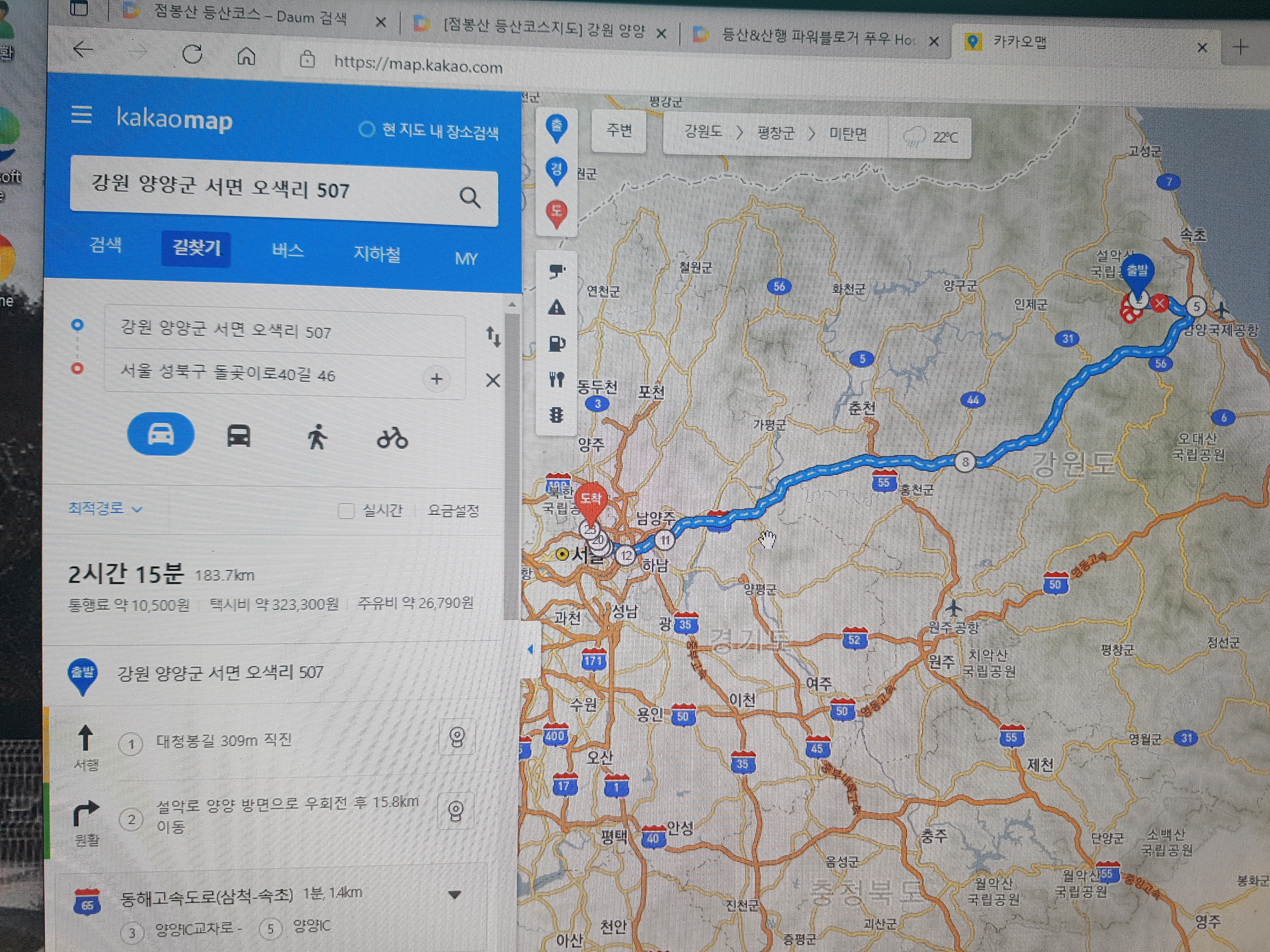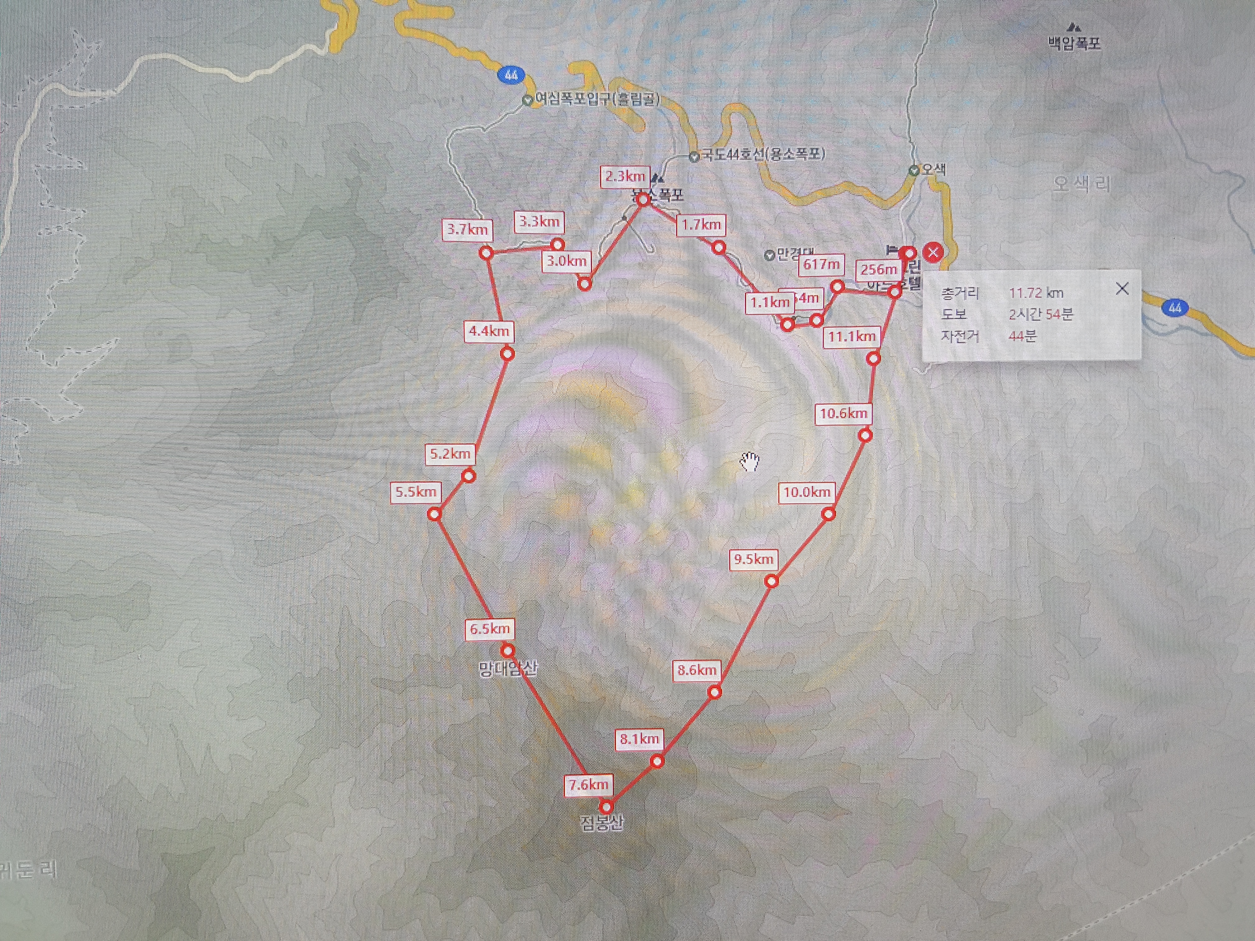 집 출발(오전 4시) - 미산너와집 도착(7시) - 방태산 등산종료(12시) - 오색주차장 도착(오후 1시 23분) - 점봉산 등산종료( 6시 53분) - 집 도착(오후 9시 3분)