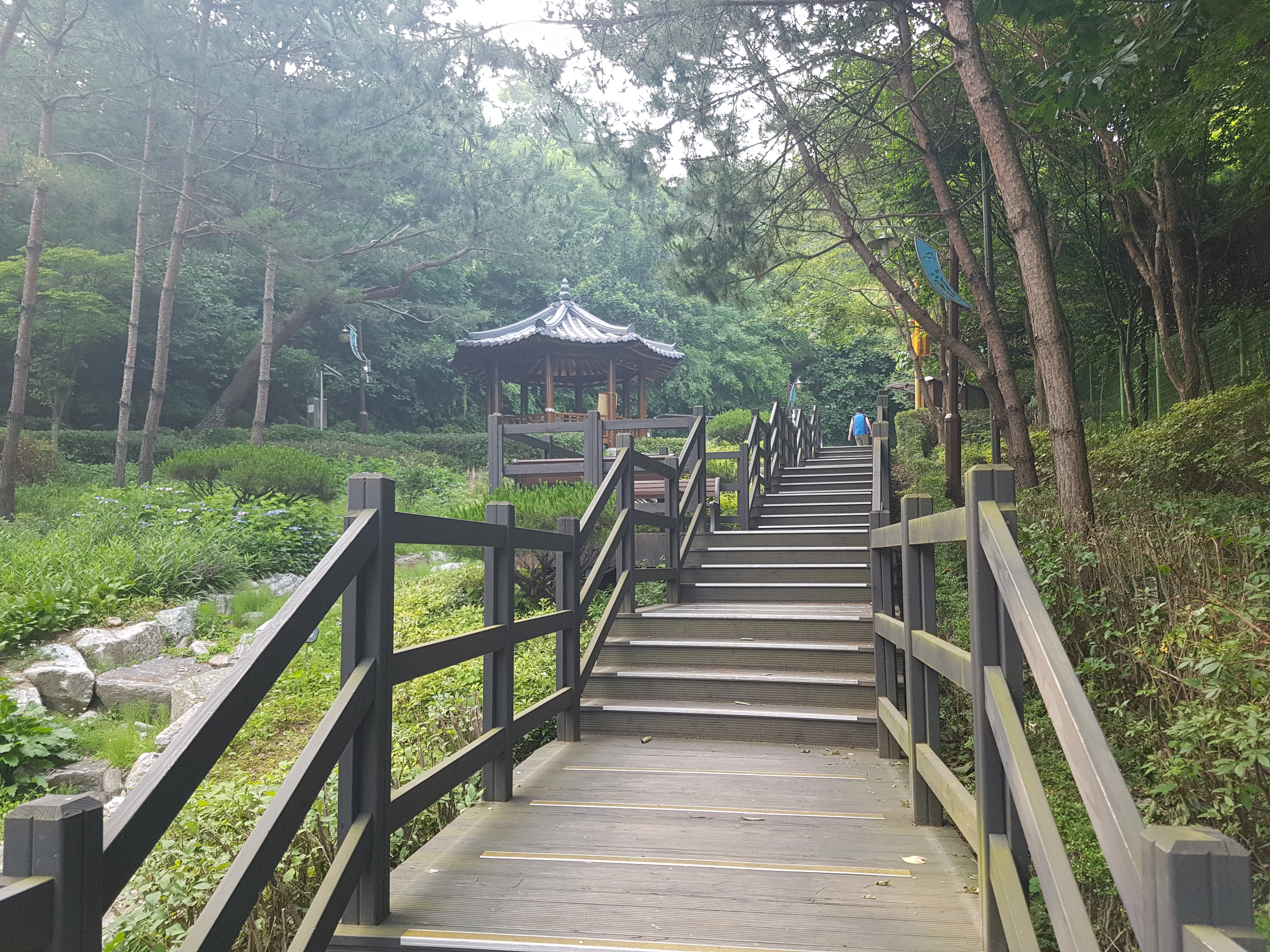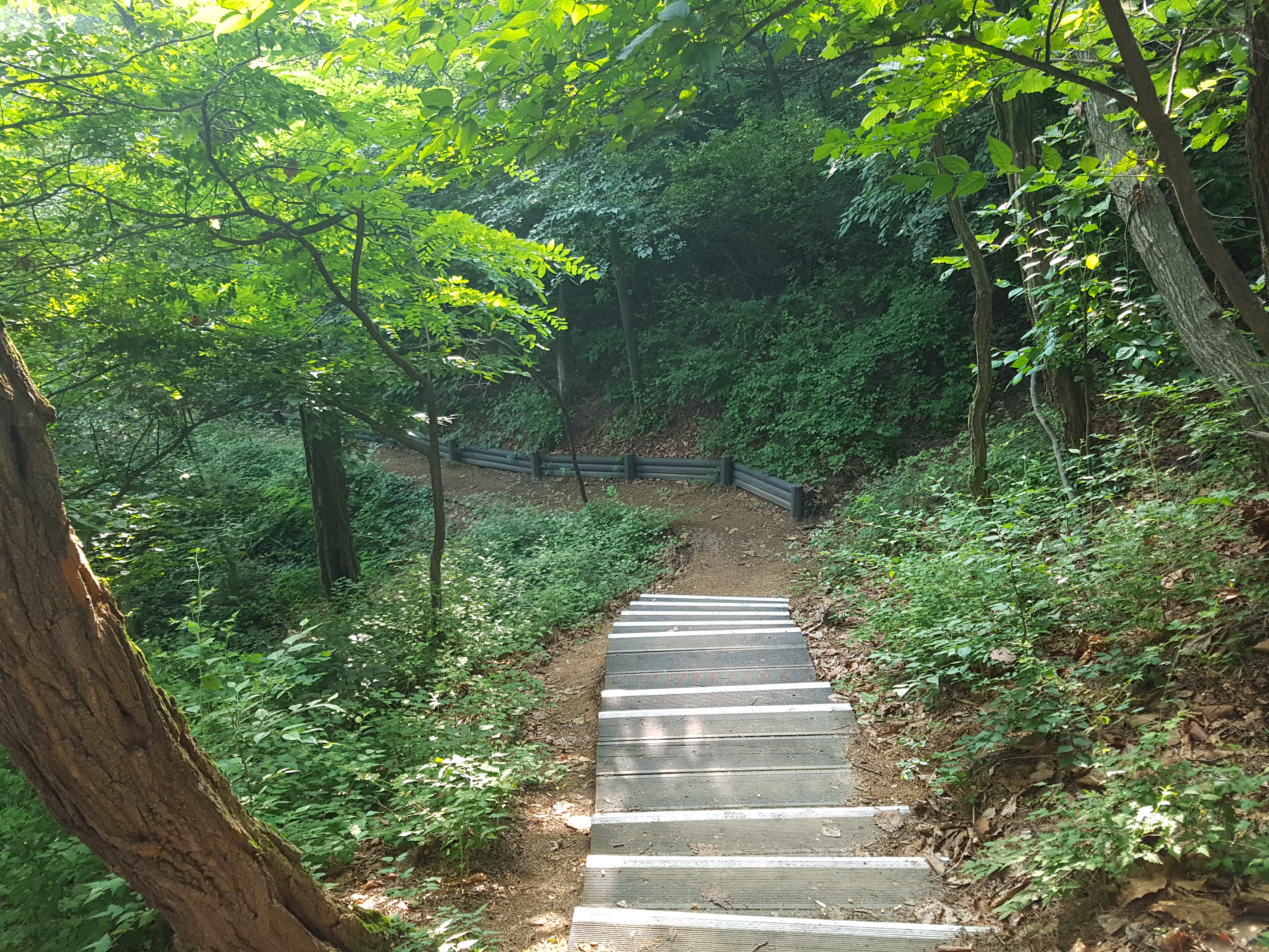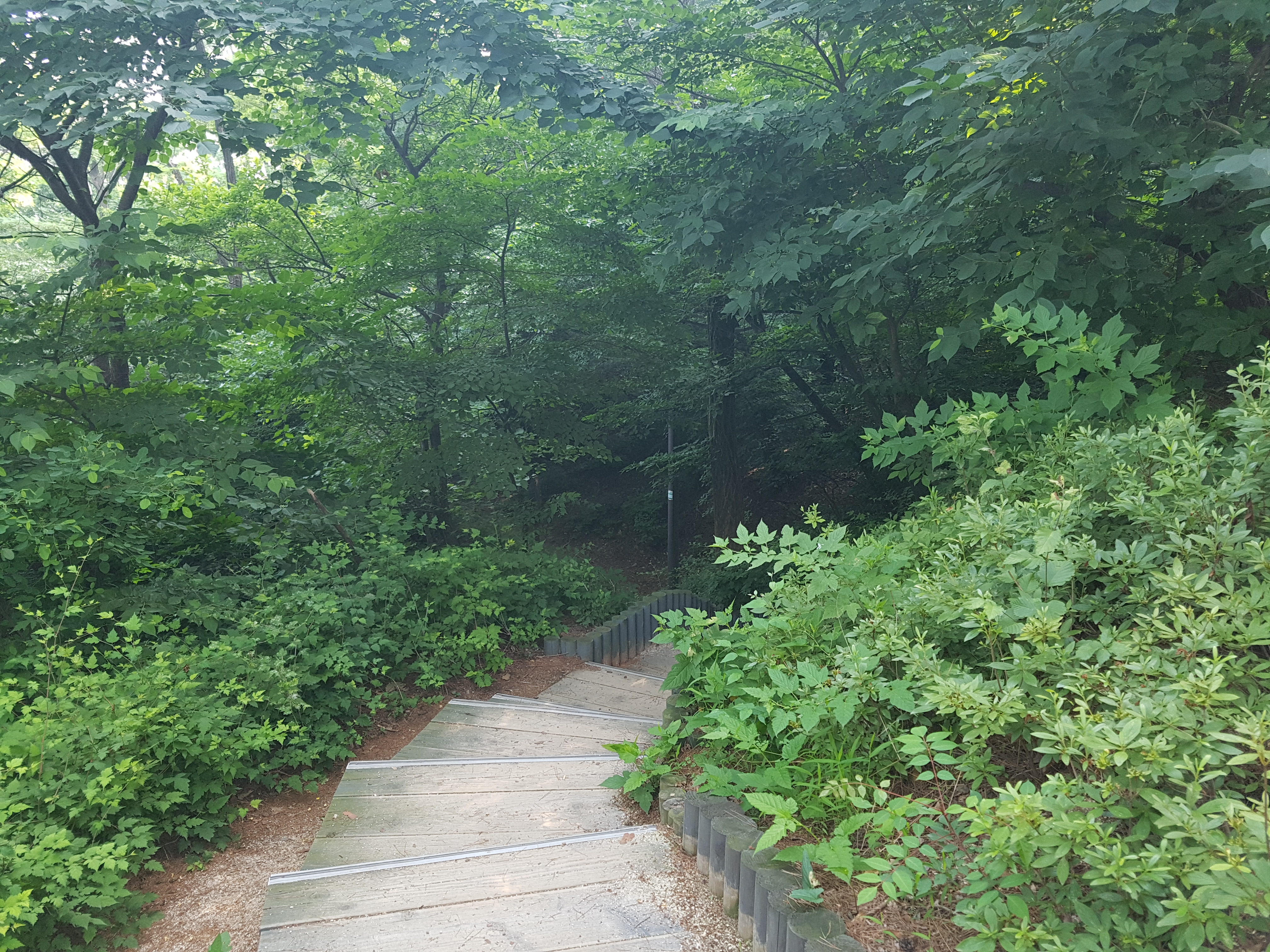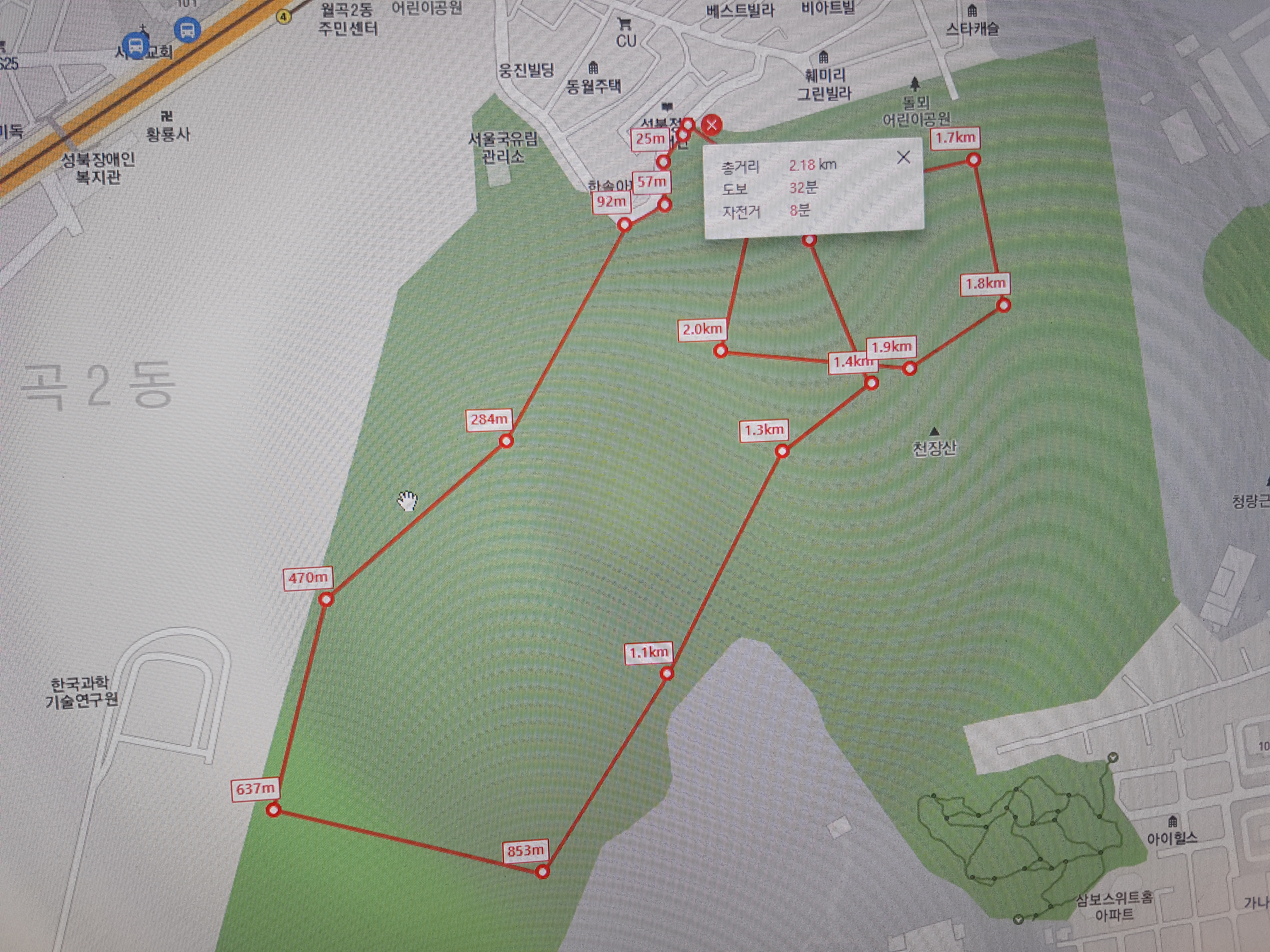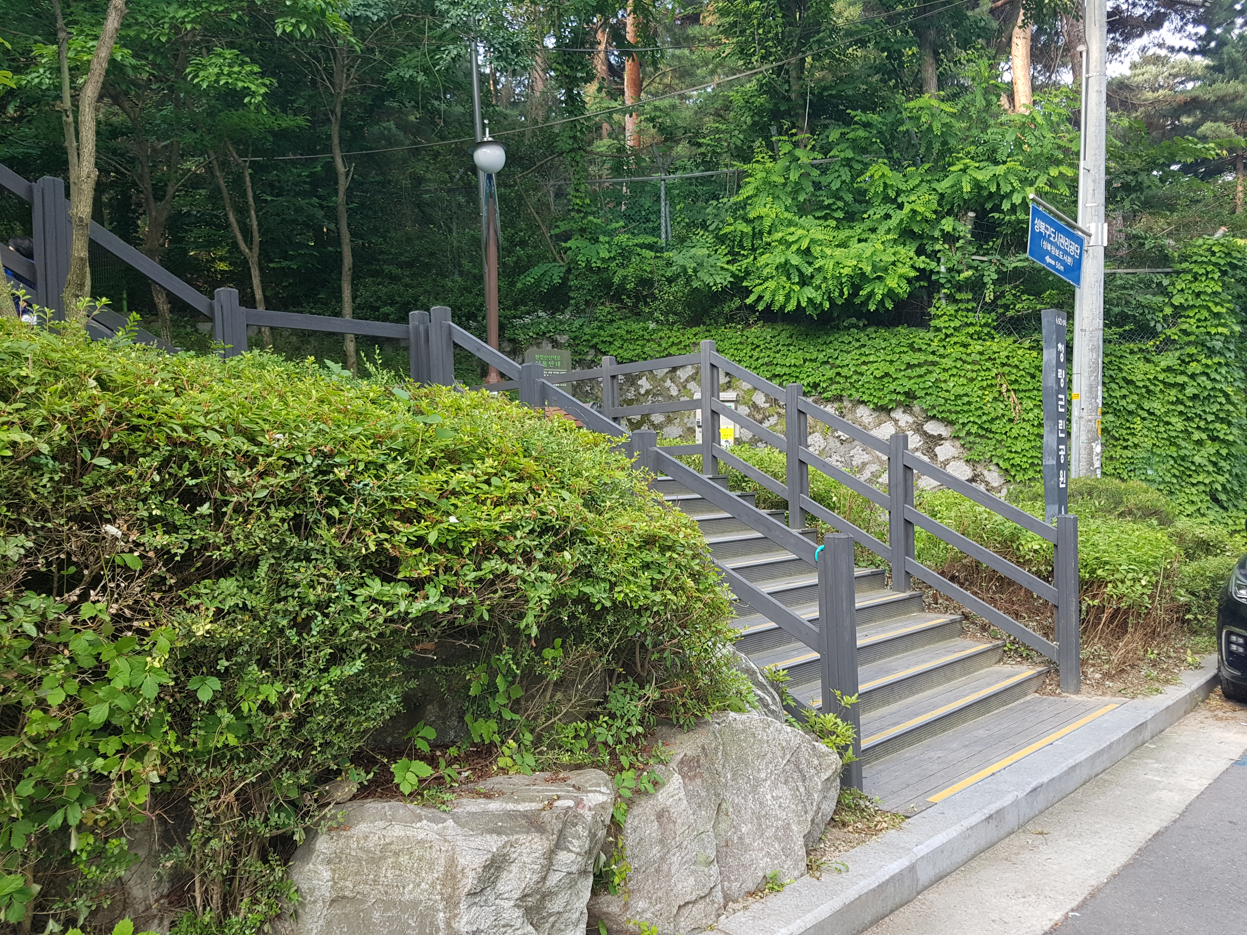 오늘 아침 7시 5분에 지하실에서 승용차를 몰고 우리 아파트에서 3km나 떨어져 있는 성북구 상월곡동에 있는 천장산과 청량공원을 조깅하러 갔는데 거의 다 철재 목재계단이라 조깅보다는 산보하러 간 것이 맞는 것 같았다. 정보도서관 주변에 차를 파킹한 후 7시 25분경에 청량공원 입구로 들어가서 우측으로 올라가는데 서울국유림 관리소 담을 끼고 한참 계단을 올라가다가 좌측으로 약간 올라갔더니 여기서부터는 의릉 울타리를 끼고 좌측을 가는데 천장산(140m)은 의릉 안에 있어서 가보지 못한 체 아래로 내려가는 목재계단을 쫓아 내려오는데 이정표가 도서관이 50m 정도 남았다고 해서 다시 우측으로 난 길로 갔더니 어린이공원이 나와 다시 우측으로 올라갔더니 천장산 부근인 조금 전에 왔던 계단이라 다시 우측으로 내려오다가 좌측으로 내려가는 계단이 있어서 조금 내려오니 쉴 수 있는 야외용테이블과 우측에 팔각정이 있는데 코로나 19 때문에 출입금지시켜서 그냥 지나쳐 성북구 정보도서관으로 내려와 8시경에 산보를 끝냈습니다. 코스도 2.5km로 짧고 거의 다 계단이라 운동으로는 내 맘에 별로인 것 같습니다. ^^