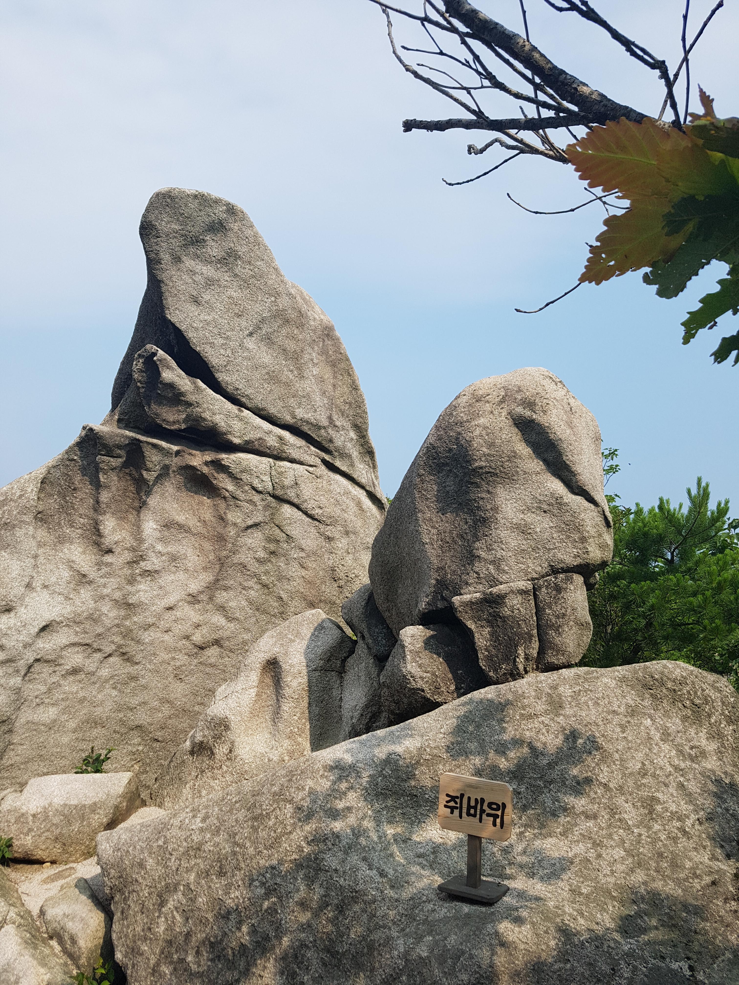 깔닥고개부터 바위가 많아 거북바위를 찾지 못할까봐 두리번거리면서 올라갔는데 2.4km 위치에 거북산장이 나올때까지 사방을 둘러봐도 거북바위가 눈에 들어오지 않아서 더 올라갔더니 정상 가까이까지 큰 바위 위로 철재목재계단으로 되어있어서 거북바위는 어제 천둥치고 비오는 바람에 어디론지 사라진 것 같았다. 정상 바로 아래 바위사이에 불암산 정상비석이 있어서 사진에 담고 정상까지 밧줄을 타고 올라가서 정상(509.7m)에 있는 태극기와 정상주변을 여러 장의 사진을 찍었다. 정상 너머로 하산하여 쥐바위, 다람쥐광장을 지나 빽바위에서 아내가 싸 준 쑥개떡을 맛있게 먹고 석장봉을 지나 3.4km 지점에서 좌측방향 당고개역을 보면서 능선을 따라 하산하기 시작하였다.