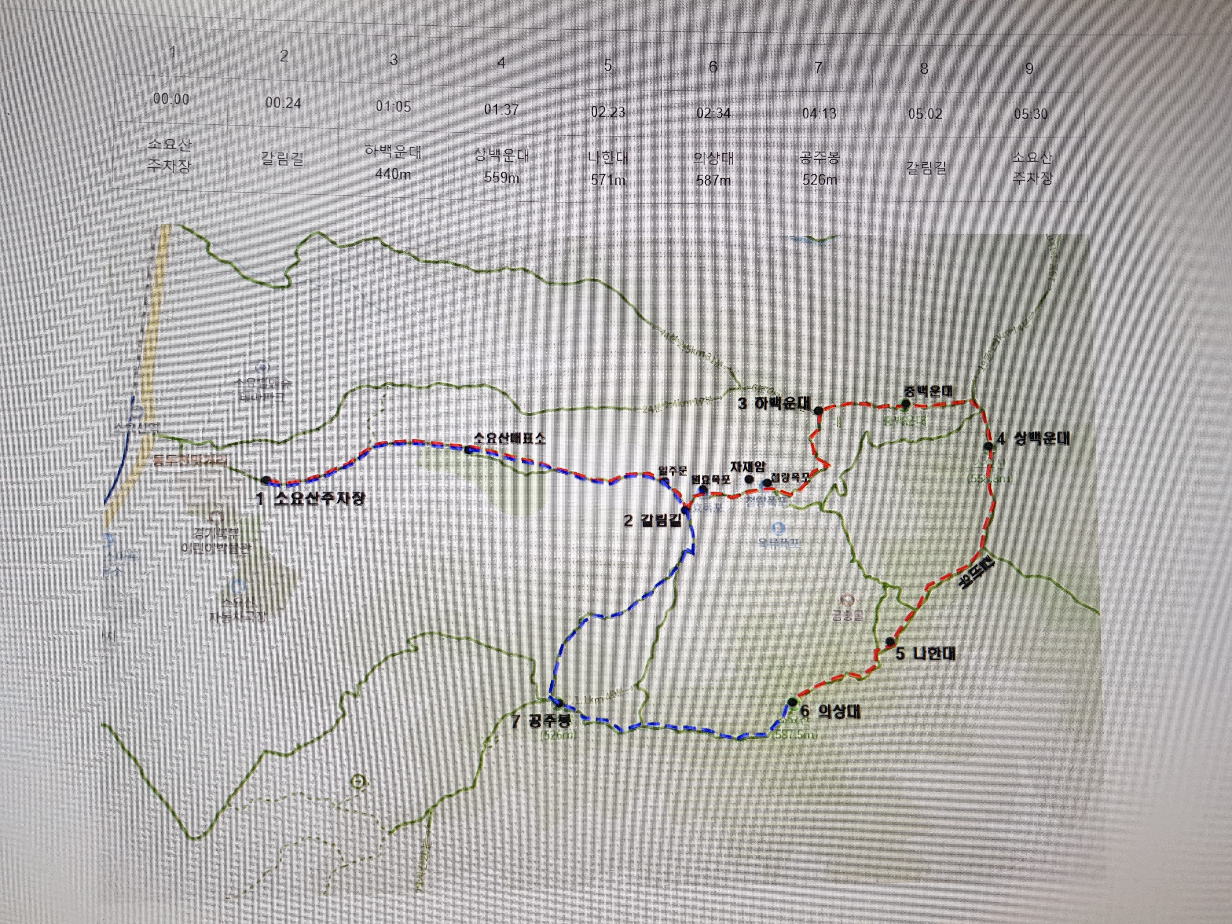 일주문 - 소요산공원 - 삼거리(우측) - 구절터(우측) - 공주봉 - (우측) - 정상(의상대) - 나한대 - 선녀탕입구1(우측) - 선녀탕입구2(우측) - 칼바위 - 상백운대 - 중백운대 - 하백운대 - 자재암 - 백운암 - 소요산공원 - 일주문