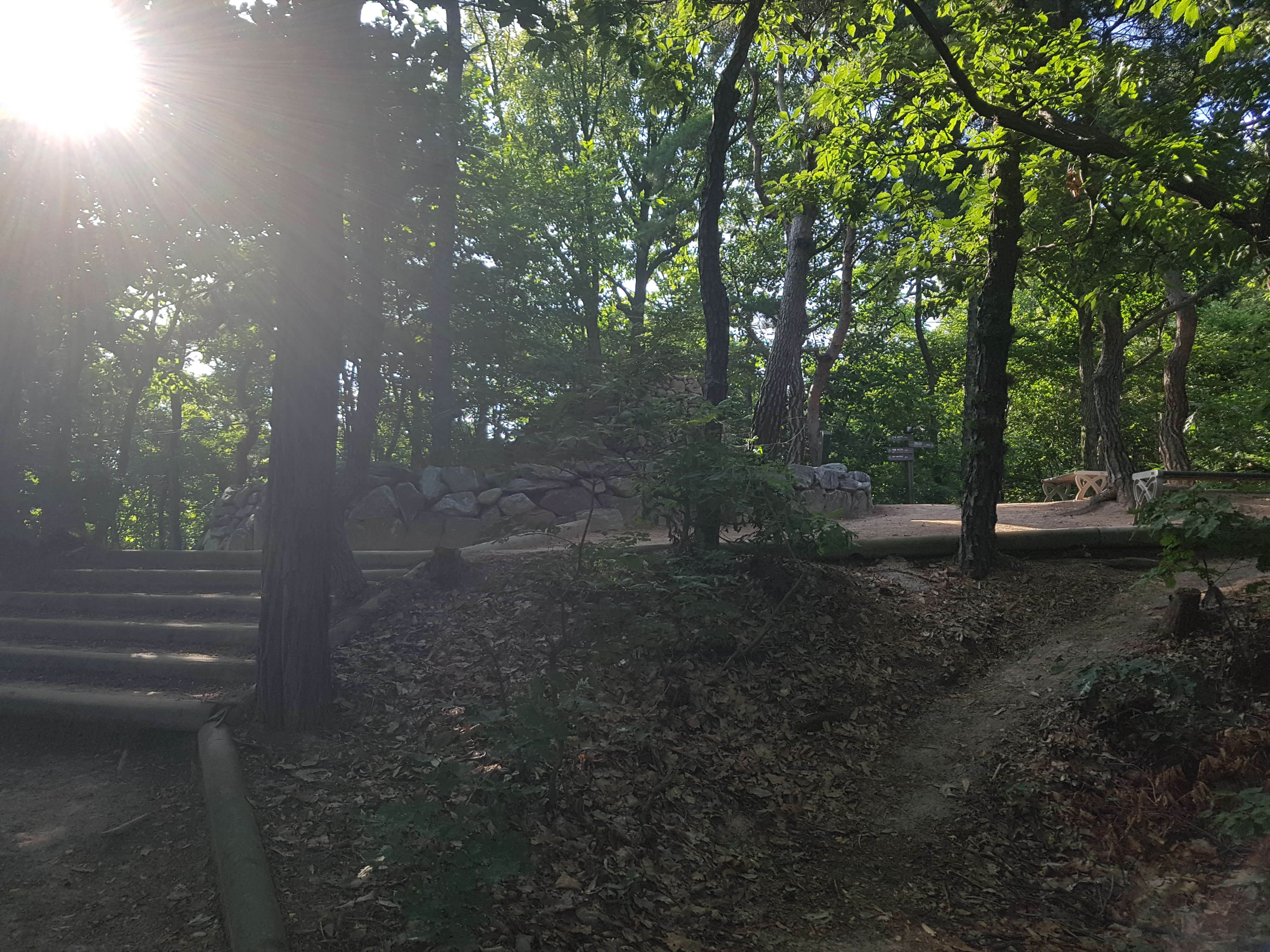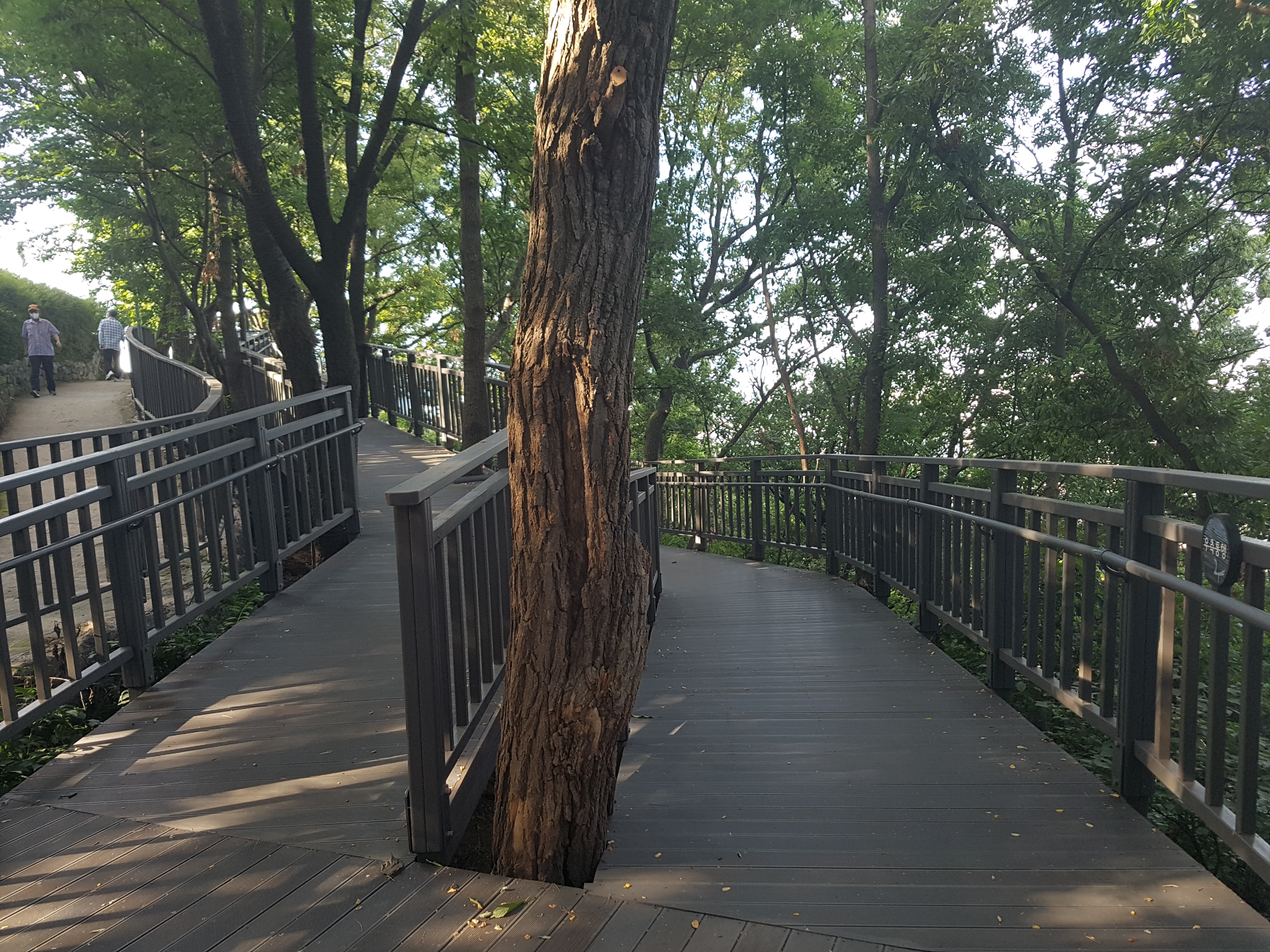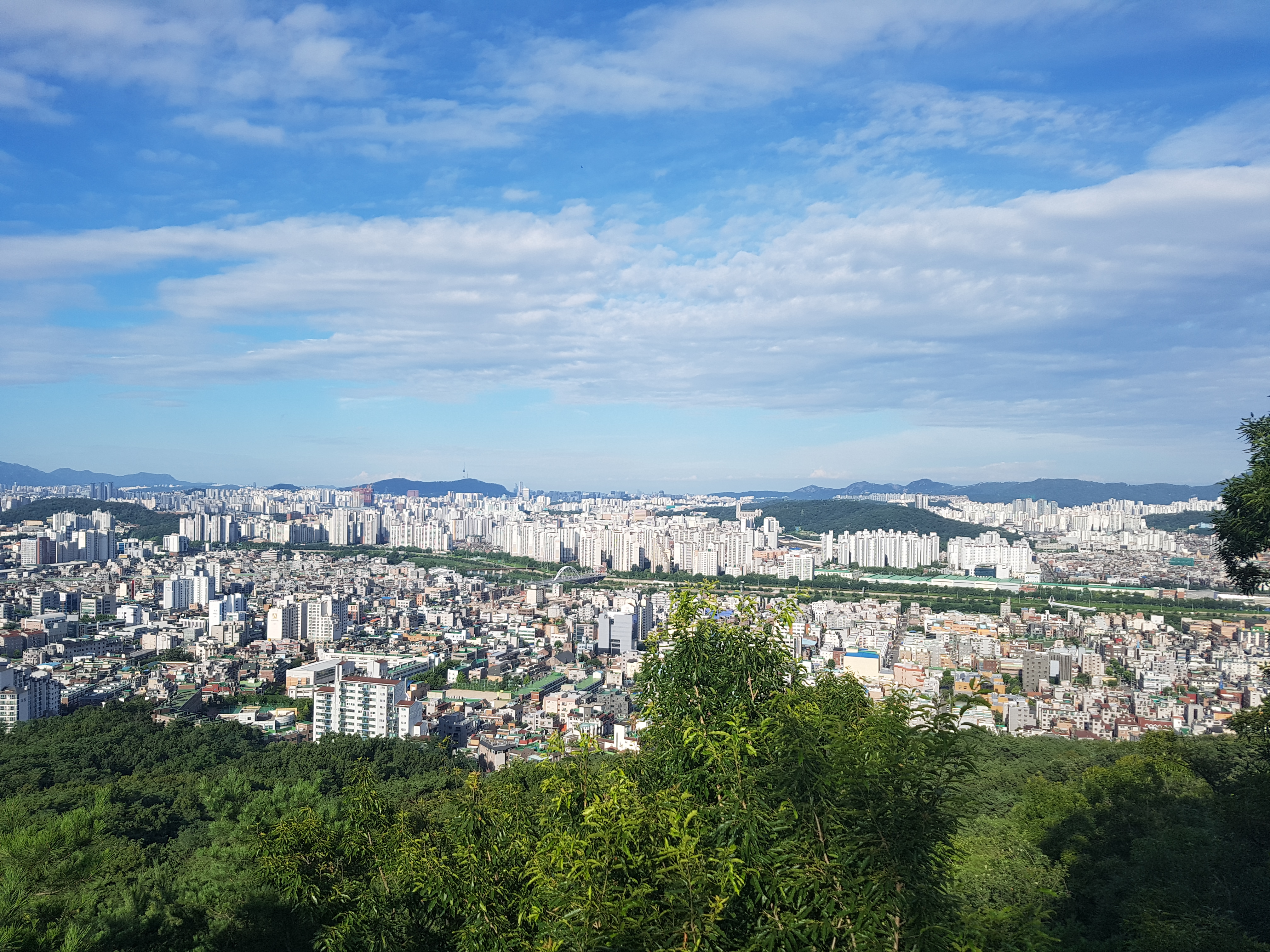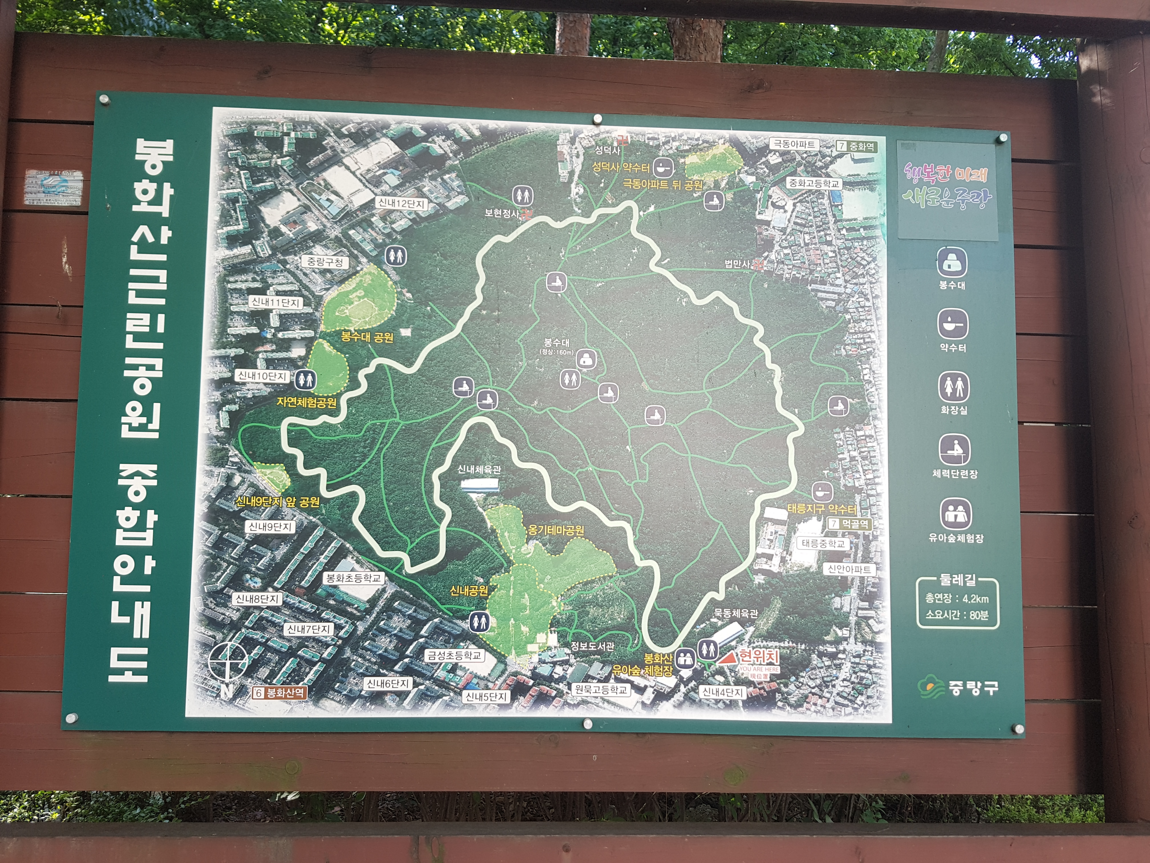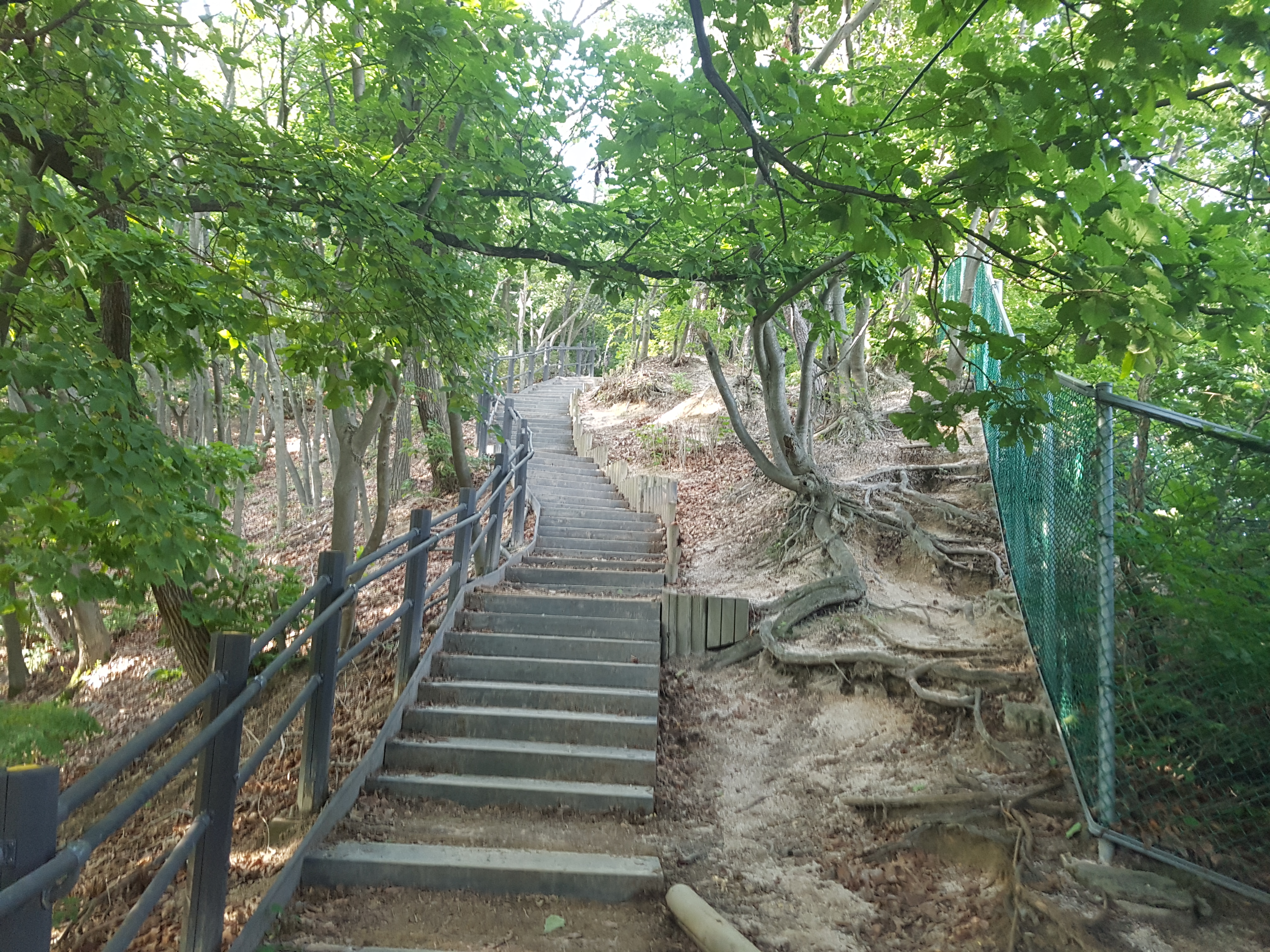 시골 연산에서 이곳 서울 성북구 장위동 개발단지 아파트로 이사 온 지 40일이 되는 날이고 일요일입니다. 우리 아파트 주변에는 근린공원이 6개 정도 있는데 다른 근린공원은 다 가보았고, 마지막으로 동쪽 4.7km 떨어져 있는 봉화산 근린공원을 오늘 조깅하려고 아침을 일찍 먹고 6시 50분경에 차를 몰고 묵동 다목적체육관 길가에 7시 15분경에 차를 세웠습니다. 길을 건너 묵동 다목적체육관 뒤 등산길로 올라가서 이정표대로 능선을 타고 600m 정도 옆길로 올라가면 봉화산 정상(159.8cm, 봉수대)에 올라가는 것 같습니다. 오늘이 일요일이라 등산객이 많아서 요즘 코로나 19가 극성을 부리는 것 같아서 마스크를 조깅을 다 할 때까지 벗지 않기로 하였습니다. 200m 올라가니 성황당이 있고, 100m를 더 올라가니 돌탑이 나왔고, 정상 다 가서 굿산신당을 돌아 봉화산 정상인 봉수대에 7시 42분에 도착하였습니다. 오늘 날씨가 좋아서 봉수대에서 서울시내가 잘 보여 사진 여러 장을 찍었습니다. 서쪽 방향으로 내려오다가 너무 내려온 것 같아서 다시 위로 올라가서 봉화산 둘레길을 찾아 남쪽-동쪽-북쪽 둘레길 4.2km을 돌아 처음 들어왔던 묵동 다목적체육관 입구에 9시경에 도착하였습니다. 오늘의 산행 조깅을 마칩니다. 즐거운 산행 조깅이어서 감사합니다.